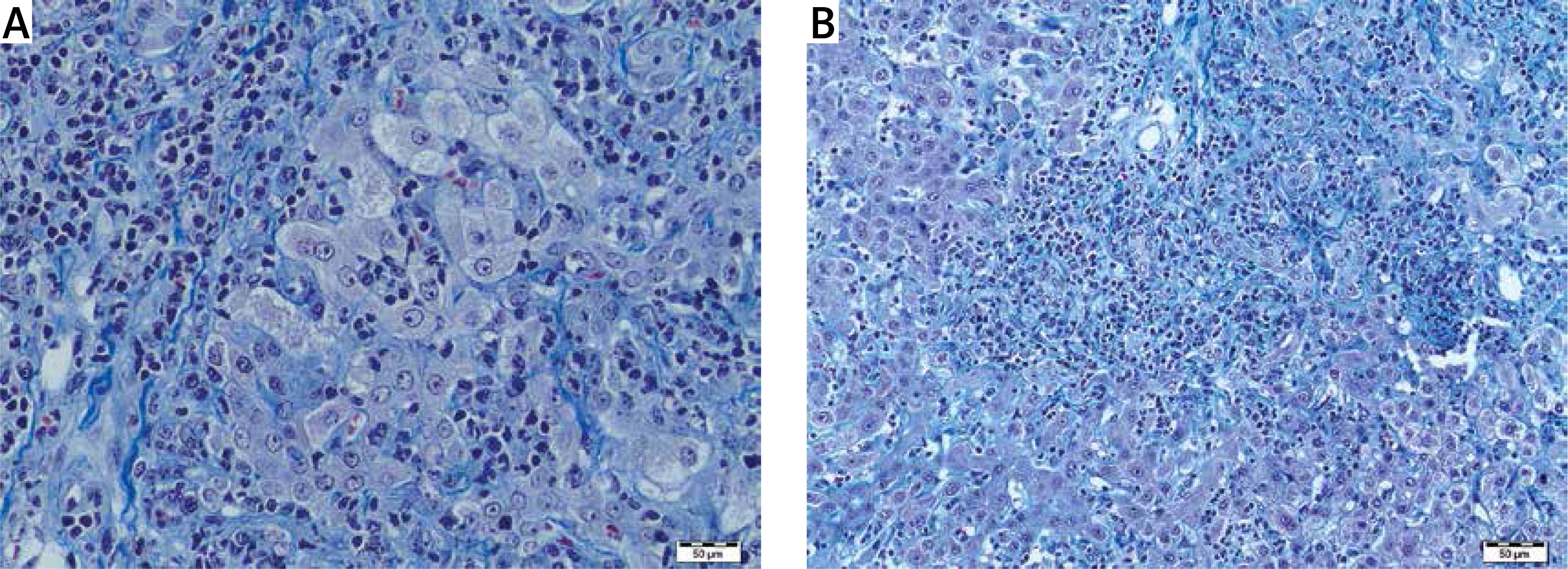 The histological changes in autoimmune hepatitis (AIH) were scored using the four-degree scale for the grade (inflammatory activity) and stage (fibrosis) of the disease. The grade was assessed as: 0 – portal inflammation only, without piecemeal necrosis, without lobular inflammation and necrosis; 1 – minimal portal inflammation, minimal, patchy piecemeal necrosis, occasional spotty necrosis; 2 – mild portal inflammation, mild piecemeal necrosis involving some or all portal tracts, little hepatocellular damage; 3 – moderate portal inflammation, moderate piecemeal necrosis involving all portal tracts, moderate lobular inflammation with noticeable hepatocellular change; 4 – severe portal inflammation, severe piecemeal necrosis, may have bridging necrosis, severe lobular inflammation with prominent diffuse hepatocellular damage. The stage was assessed as: 0 – no fibrosis, normal connective tissue; 1 – portal fibrosis, fibrous portal expansion; 2 – periportal fibrosis, periportal or rare portal-portal septa; 3 – septal fibrosis, fibrous septa with architectural distortion; 4 – cirrhosis.