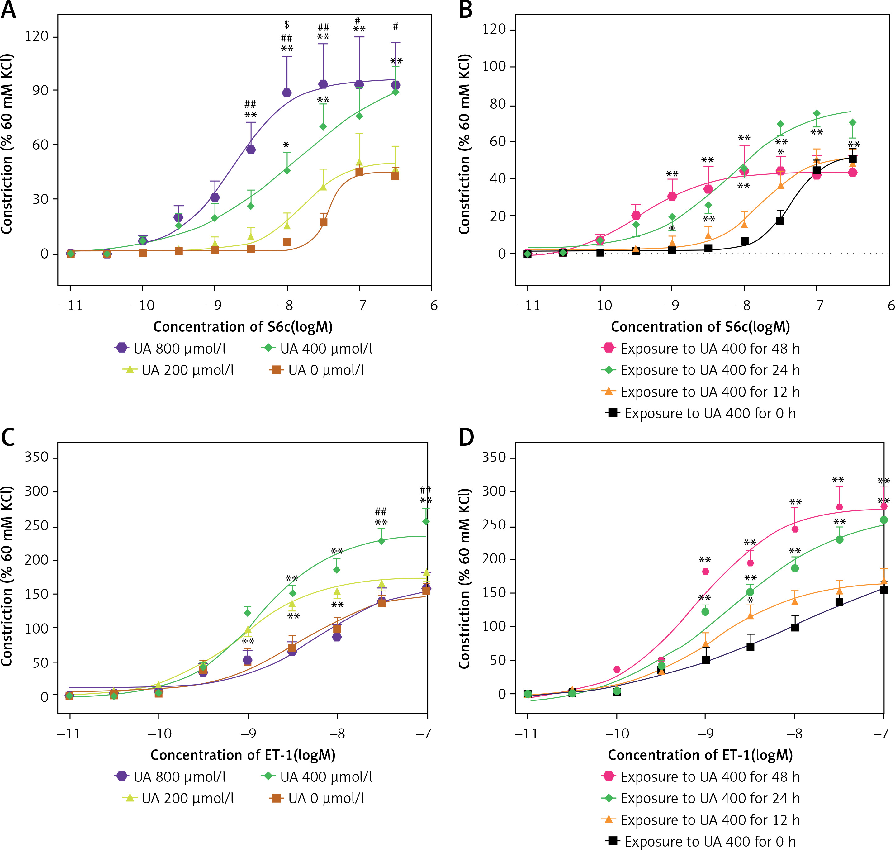 The effects of high levels of UA on concentration-contractile curves for rat cerebral artery segments, as meditated by ET receptors. A – Dose-dependent curve of cerebral artery constriction induced by S6c. B – Time-dependent curve of cerebral artery constriction induced by S6c. C – Dose-dependent curve of cerebral artery constriction induced by ET-1. D – Time-dependent curve of cerebral artery constriction induced by ET-1. Data are presented as mean ± SEM. n = 12. *p < 0.05, **p < 0.01 vs. UA 0 μmol/l (A, C); #p < 0.05, ##p < 0.01 vs. UA 200 μmol/l (A, C); $p < 0.05 vs. UA 400 μmol/l (A) or *p < 0.05, **p < 0.01 vs. Exposure to UA 400 μmol/l for 0 h (B, D)