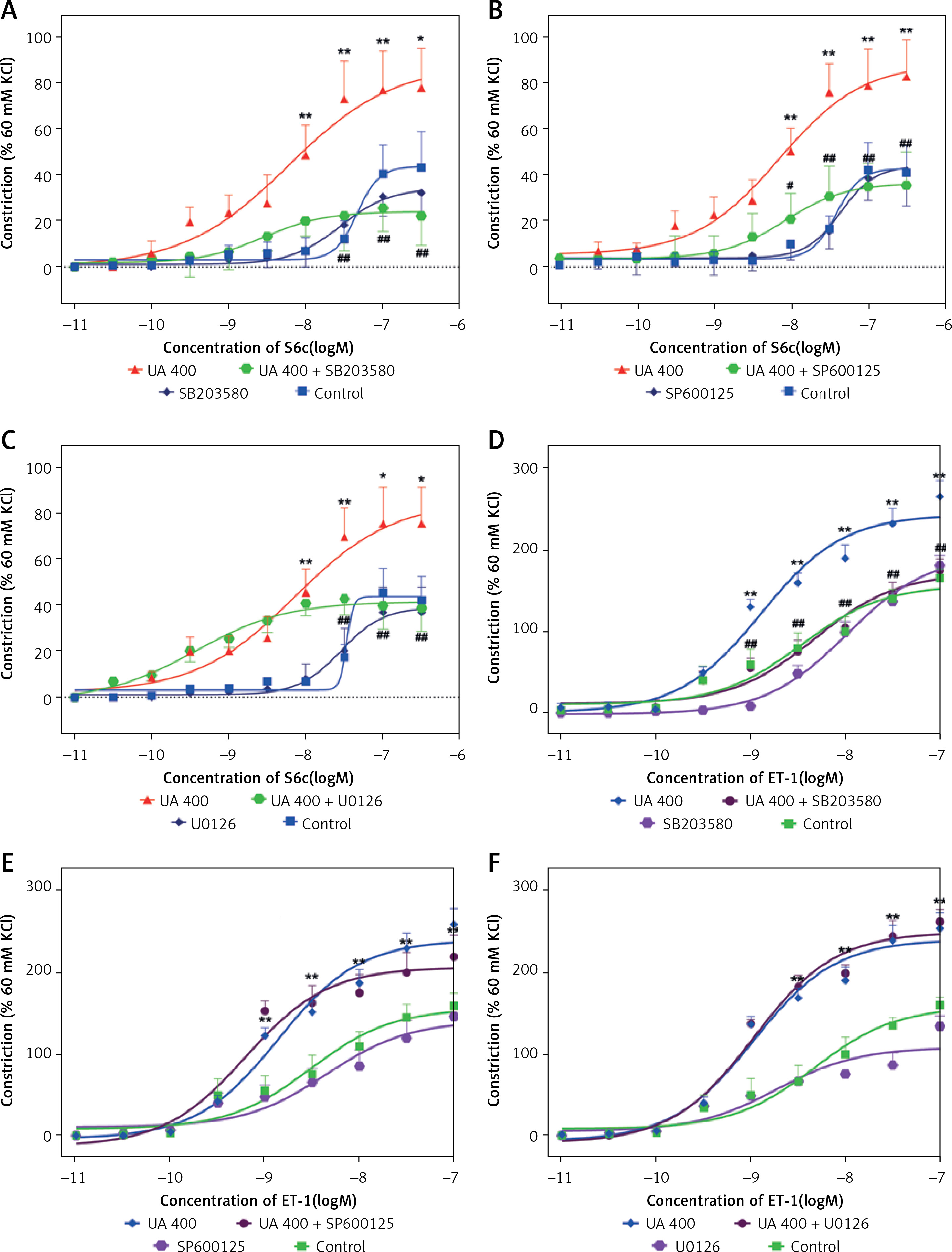 Effects of MAPK pathway inhibitors on UA-induced enhancement of ETB (A, B, C) and ETA (D, E, F) receptor-mediated concentration-contraction curves for rat cerebral arteries. The cerebral artery segments were cultured with or without UA 400 μmol/l for 24 h. In addition, the segments were cultured with UA 400 μmol/l and different MAPK inhibitors and DMSO for 24 h. S6c-induced and ET-1-induced contractions were recorded, and concentration- contraction curves for p38 inhibitor SB203580 (A, D), JNK inhibitor SP600125 (B, E), and ERK1/2 inhibitor U0126 (C, F) were constructed. Data are presented as mean ± SEM. n = 12. *p < 0.05, **p < 0.01 vs. Control (cultured with DMSO); #p < 0.05, ##p < 0.01 vs. UA 400 μmol/l