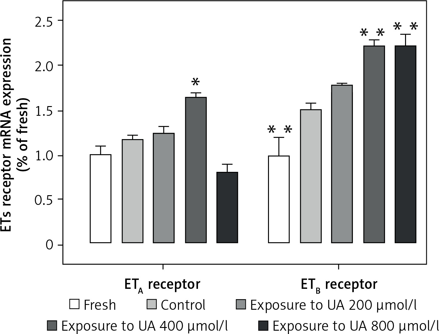 Figure 3 demonstrates that UA at concentrations of 400 µmol/l and 800 µmol/l stimulated the de novo transcription of ETB receptor mRNA. We found that exposure to UA 400 µmol/l significantly elevated the expression of ETA receptor mRNA (p < 0.05, Figure 3). However, when the UA concentration was increased to 800 µmol/l, there was a non-significant downward trend in the ETA receptor mRNA level.