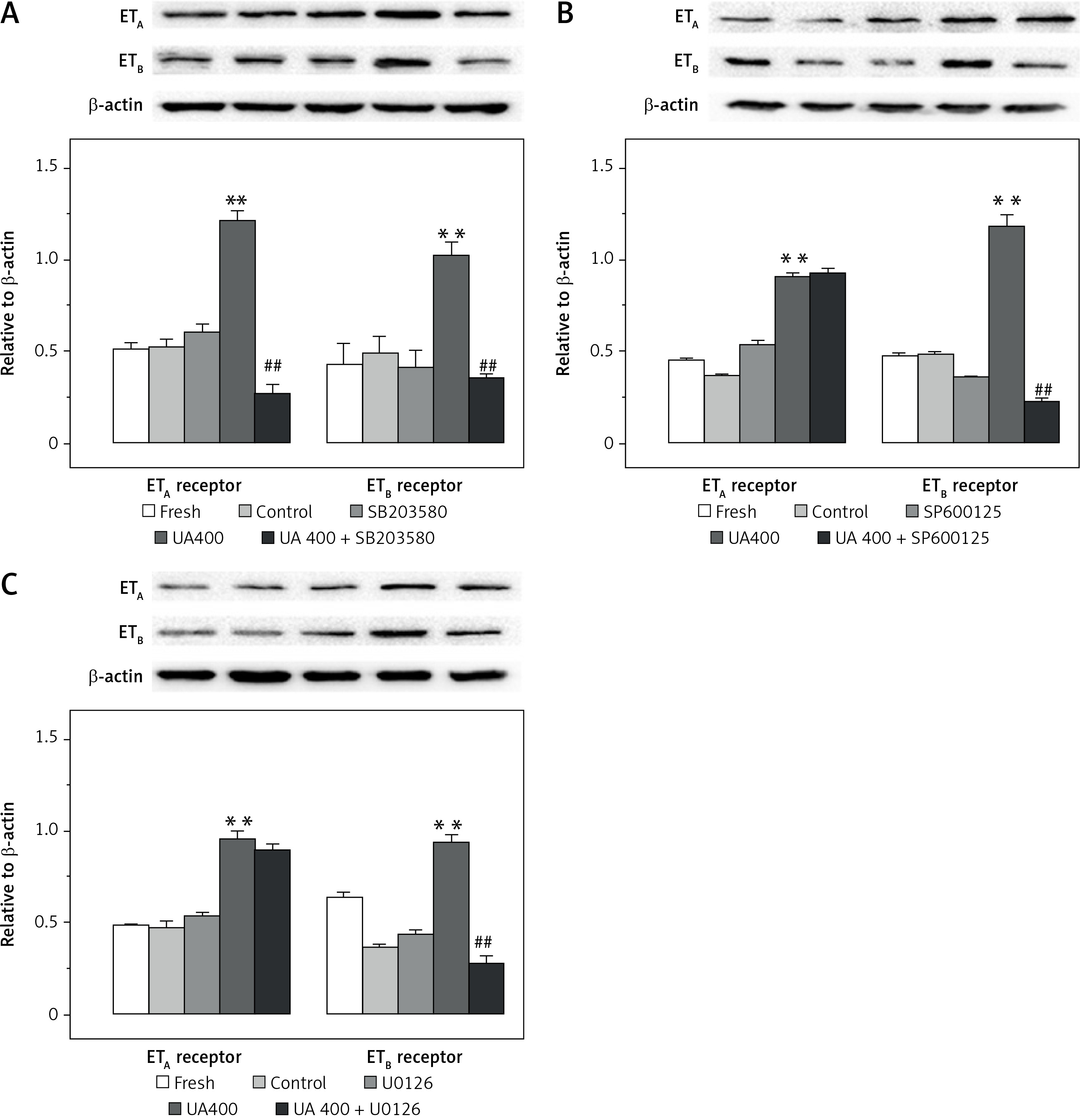 Effects of UA 400 μmol/l on protein expression in cerebral arteries with the influence of MAPK inhibitors. Rat cerebral arterial segments were cultured with UA 400 μmol/l and p38 inhibitor SB203580 (A), JNK inhibitor SP600125 (B), ERK1/2 inhibitor U0126 (C), and DMSO for 24 h. The ET receptor protein expression levels were expressed relative to β-actin. Data are presented as mean ± SEM. n = 3. **p < 0.01 vs. Control (cultured with DMSO). ##p < 0.01 vs. UA 400 μmol/l