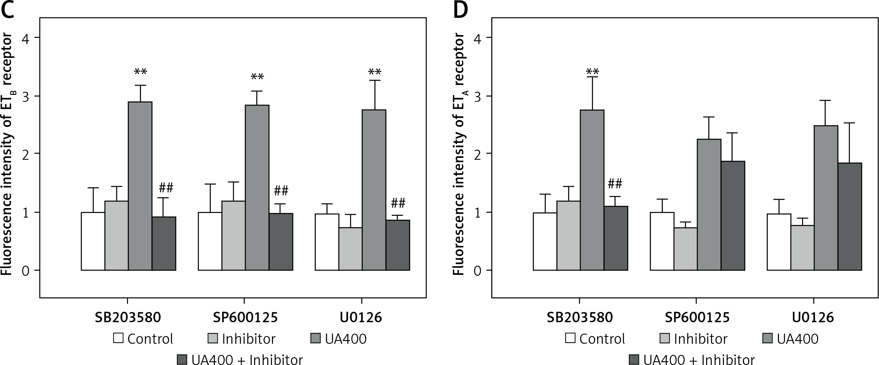 Immunohistology analysis of the effects of high levels of UA and MAPK inhibitors on ET receptor protein expression in cerebral arteries. Rat cerebral arterial segments were cultured with UA 400 μmol/l and MAPK inhibitors or DMSO for 24 h. Representative images for each group (A – ETB receptor, B – ETA receptor). Scale bar 100 μm, magnification × 20. Data are presented as mean ± SEM. n = 3. **p < 0.01 vs. Control. ##p < 0.01 vs. UA 400 μmol/l Representative images for each group the results of analyses (C – ETB receptor, D – ETA receptor). Scale bar 100 μm, magnification. 20. Data are presented as mean ± SEM. n = 3. **p < 0.01 vs. Control. ##p < 0.01 vs. UA 400 μmol/l