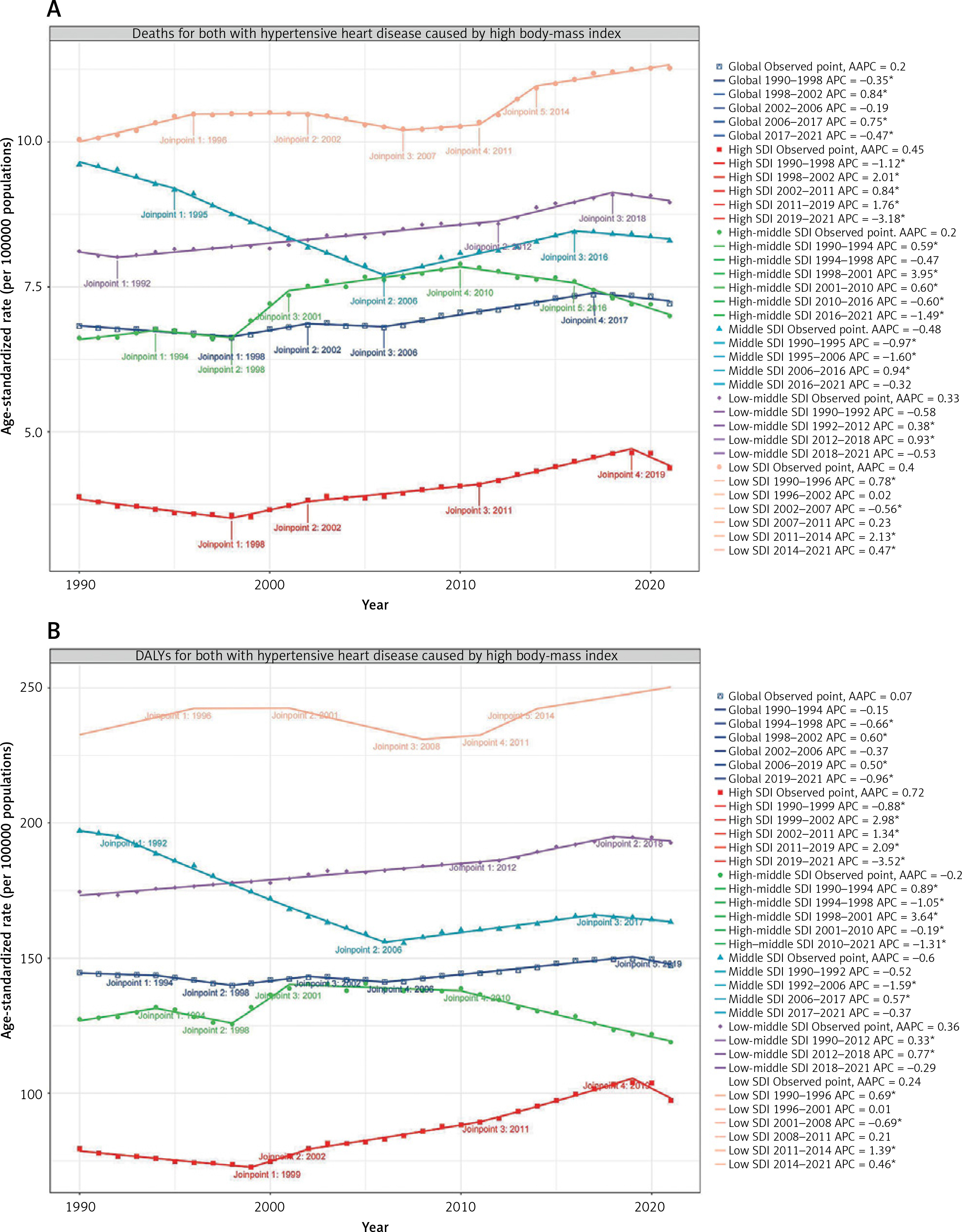 Joinpoint regression analysis. A – Joinpoint regression analysis of ASMR for HHD attributable to HBMI globally and for SDI quintiles from 1990 to 2021. B – Joinpoint regression analysis of ASDR for HHD attributable to HBMI globally and for SDI quintiles from 1990 to 2021