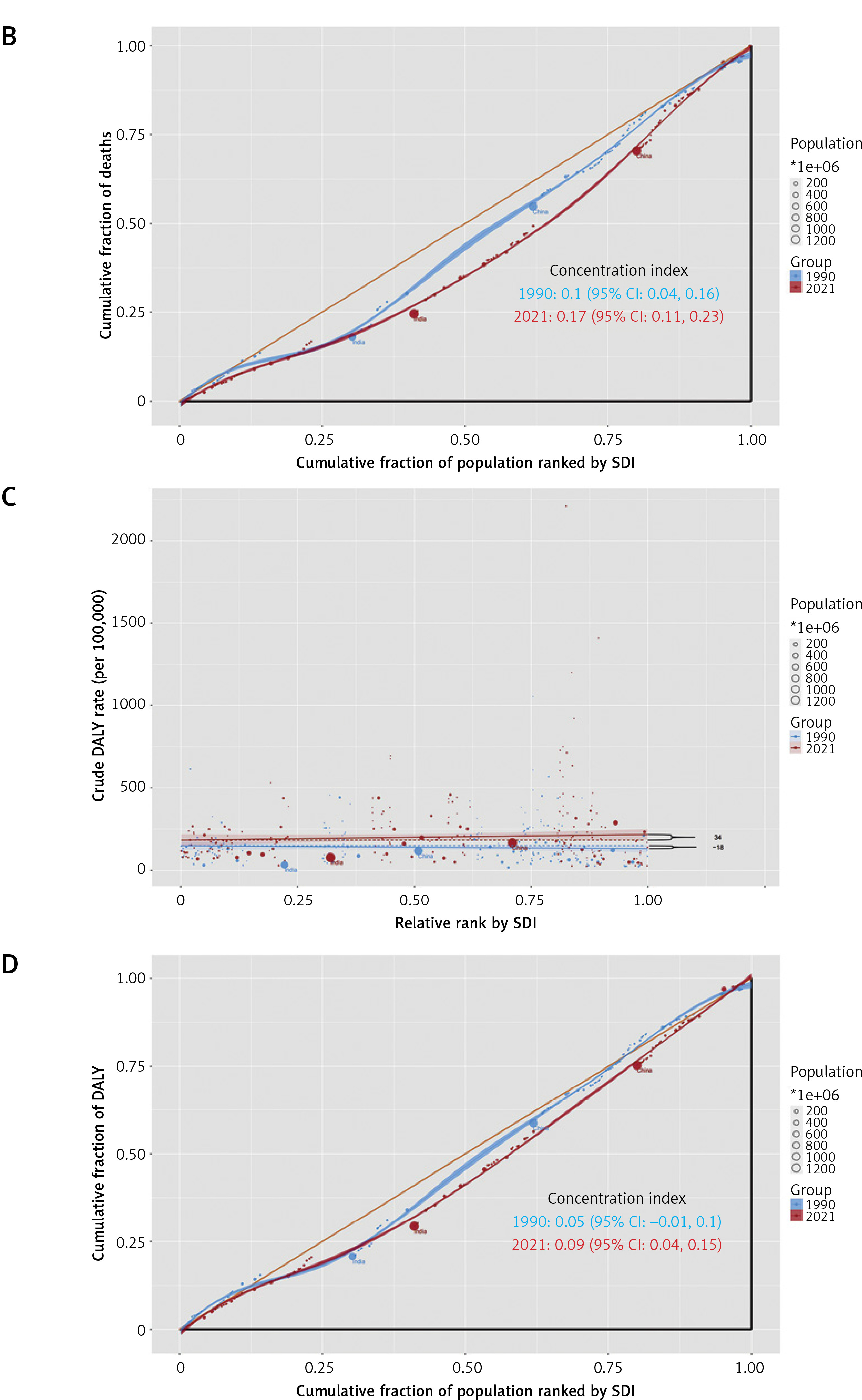 Figure 4 illustrates that the crude death rates and crude DALY rates for HHD attributable to HBMI are significantly correlated with SDI-related inequality, which increases over time. Notably, deaths and DALYs are disproportionately concentrated in countries with higher levels of sociodemographic development. The skewness index indicates that between 1990 and 2021, the rate of crude deaths per 100,000 people in countries with the highest SDIs compared to those with the lowest increased from 1 to 6. Similarly, the crude DALY rate per 100,000 people rose from -18 to 34. Additionally, as a measure of relative gradient inequality, the cumulative fraction of deaths was 0.10 (95% CI: 0.04–0.16) in 1990 and increased to 0.17 (95% CI: 0.11–0.23) in 2021. The cumulative fraction of DALYs rose from 0.05 (95% CI: –0.01–0.10) in 1990 to 0.09 (95% CI: 0.04–0.15) in 2021, suggesting an uneven distribution of the burden among different SDI countries.