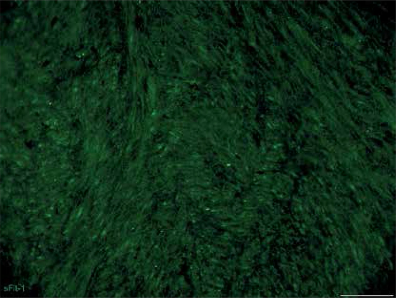 Sample of leiomyoma stained for sFlt-1 (VEGFR-1) (green, Alexa Fluor 488). Immunopositive cells are located mostly close to vessels within leiomyoma; some of them are observed between myometrial fibers. Scale magnification bar: 50 μm
