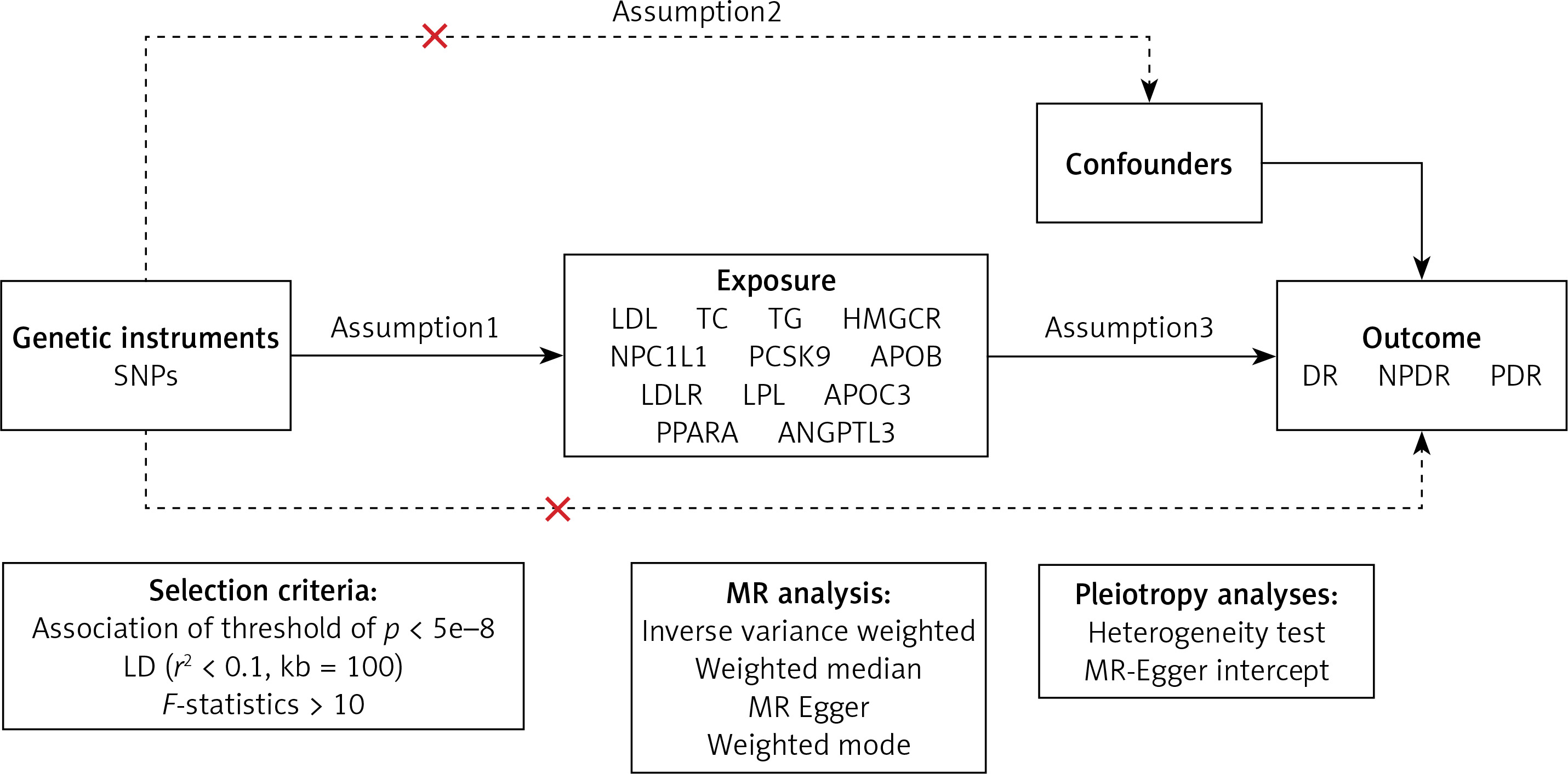 To overcome the limitations of observational studies, the use of MR methods leveraging comprehensive summary data from genome-wide association studies (GWAS) is gaining traction. MR harnesses genetic variations as inherent experiments to provide insights into potential causal relationships between risk factors and diseases, with reduced susceptibility to environmental confounders or reverse causation [19]. In drug target MR analysis, the simulation involves the pharmacological blockade of genetic drug targets utilizing pertinent genetic variants as instrumental variables, encompassing quantitative trait loci for expression (eQTLs) and protein (pQTLs). This approach is employed to assess the consequences of drug exposure [20]. Using a drug-target MR approach, this study simulates exposure to lipid-lowering drugs in diabetic patients to elucidate the causal relationship between these drugs and DR and to provide a basis for clinical strategies for the prevention and treatment of DR.