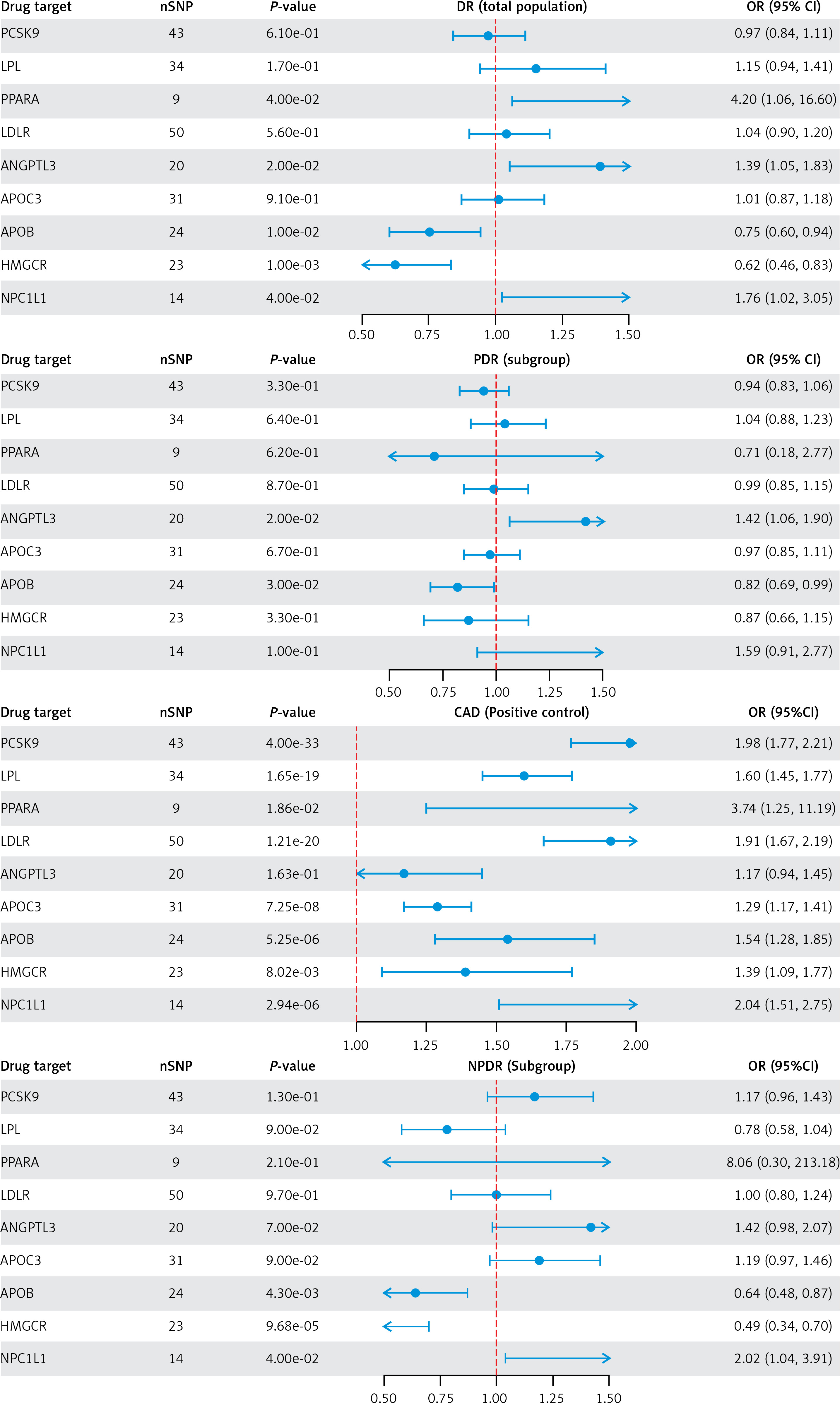 Figure 3 illustrates the effects of genetically proxied lipid-lowering drugs on DR. Our analysis revealed nuanced and differential effects across various drug targets. HMGCR targets showed the most consistent and significant protective effects with DR subtypes. In the DR (OR = 0.62; 95% CI: 0.46–0.83; p = 0.01) and NPDR (OR = 0.49; 95% CI: 0.34–0.70; p = 9.70 × 10–3) populations, genetically modelled HMGCR augmentation and a 1 mmol/l (88.9 mg/dl) rise in TG were associated with a lower risk of DR and NPDR. APOB targets showed consistent risk reduction across DR subtypes. Genetic simulation of APOB enhancement also showed associations with low DR risk (DR: OR = 0.75; 95% CI: 0.60–0.94; p = 0.01; NPDR: OR = 0.64; 95% CI: 0.48–0.87; p = 4.30 × 10–3; PDR: OR = 0.82; 95% CI: 0.69–0.99; p = 0.03). Notably, the protective effect was most pronounced in the NPDR subgroup. Conversely, genetic simulation of ANGPTL3 enhancement was observed to increase the risk of DR and PDR. However, the significance of the associations of ANGPTL3 and APOB with outcomes diminished after Bonferroni correction, warranting cautious interpretation. Notably, no significant relationships were identified between the other genetically simulated drug targets and DR outcomes.