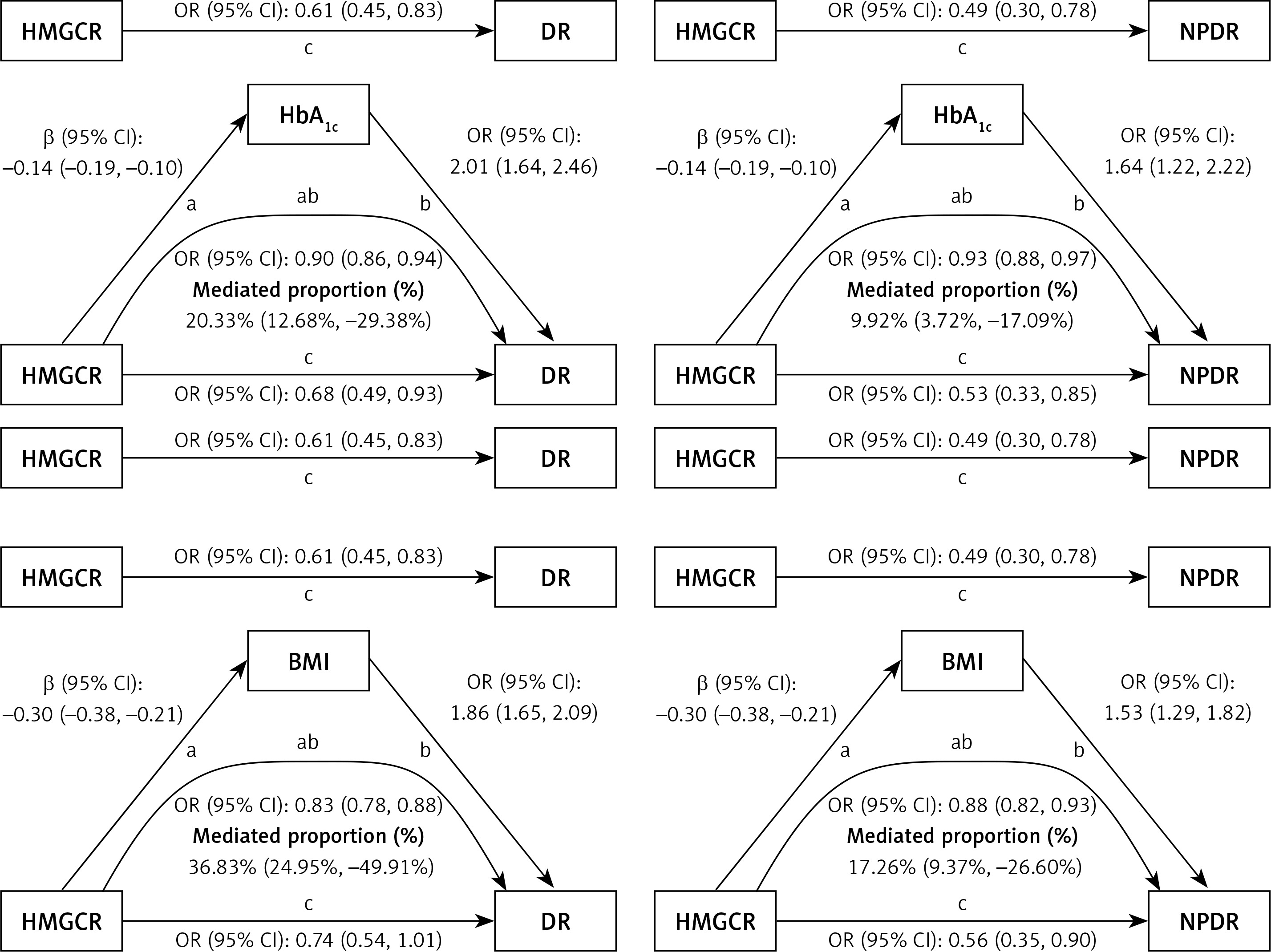In the current study, genetic simulation of HMGCR and APOB was associated with a decreased risk of any DR and NPDR, which is consistent with the findings of Chen et al. However, this protective effect does not seem to extend to PDR. Additionally, mediation analyses demonstrated that the protective impact of HMGCR on DR was partially mediated by HbA1c and BMI, with the causal effect of HMGCR on these two mediating variables resembling previous findings [40, 41]. An animal model-based investigation revealed that reduced HMGCR expression led to elevated dietary intake and fat storage, potentially mediated by target of brain insulin (TOBI) regulation through modulation of α-glucosidase gene expression to regulate blood glucose levels [42]. This discovery implies that genetic mimicry of HMGCR to promote blood glucose and BMI reduction may be associated with this phenomenon. The study further confirmed the association between HMGCR and BMI by observing weight gain resulting from statin drug administration [43]. Chronic hyperglycemia induces oxidative stress by increasing reactive oxygen species (ROS) production, triggering an inflammatory cascade resulting in vascular wall damage and increased vascular permeability, activation of protein kinase C and advanced glycation end-products (AGEs), and endothelial dysfunction. In addition, sustained high blood glucose levels lead to pericyte detachment and basement membrane thickening, impaired neurovascular coupling, and disruption of retinal microcirculation. These series of metabolic and physiological disturbances ultimately induce the development of DR.