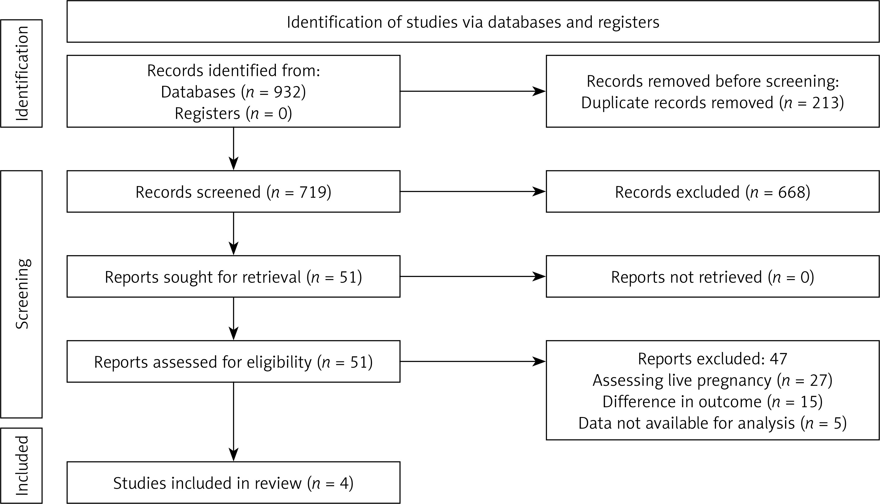 Overall, after searching all the databases, 932 studies were obtained, and they underwent duplicate removal. Then, primary screening of titles and abstracts was conducted, and 51 full texts were retrieved. After screening these full texts with eligibility criteria, four studies satisfied all the criteria and were included in the review and meta-analysis (Figure 1) [14, 26–28].