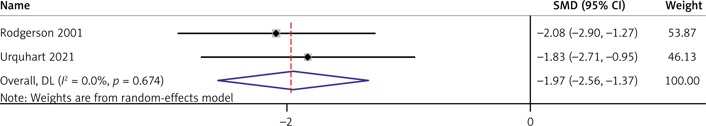 In this meta-analysis of two studies with a total of 69 participants, the pooled SMD using the random-effects inverse-variance model was –1.965 (95% CI: –2.562 to –1.368), indicating a significant overall effect (z = –6.453, p < 0.001) (Figure 2). The heterogeneity was negligible, with an I2 of 0.0% (Cochran’s Q = 0.18, p = 0.674), suggesting consistency among the included studies. These results demonstrate a substantial and uniform effect of reduction in time to diagnosis due to use of POCUS in an emergency setting across the studies analyzed. Additional subgroup analysis, prediction interval estimation, sensitivity analysis and publication bias assessment could not be performed for this outcome due to inclusion of only two studies for analysis.