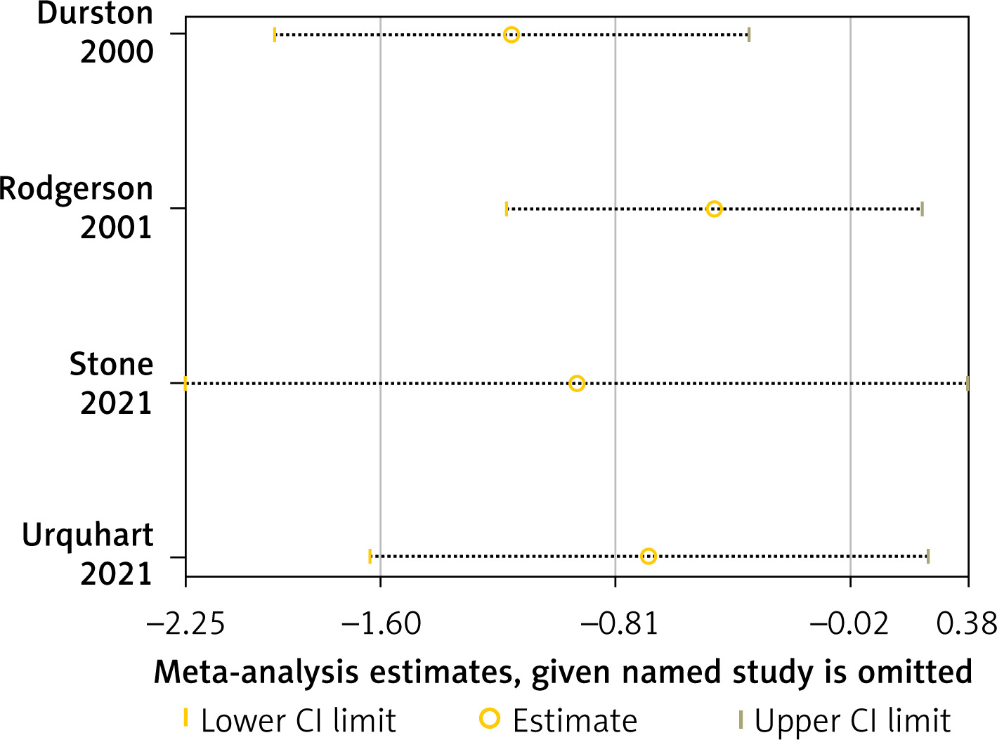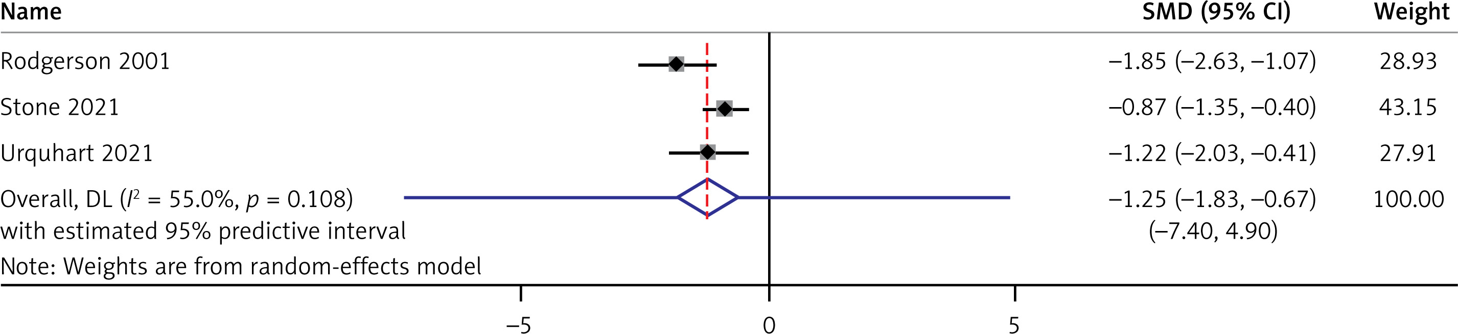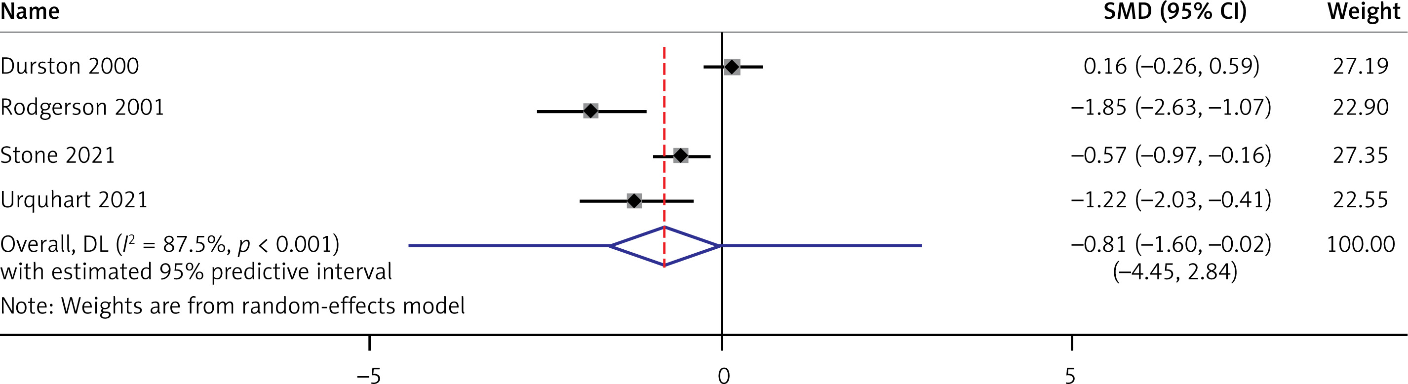 The prediction interval ranged from –4.45 to 2.84, highlighting a wide range of possible true effects.