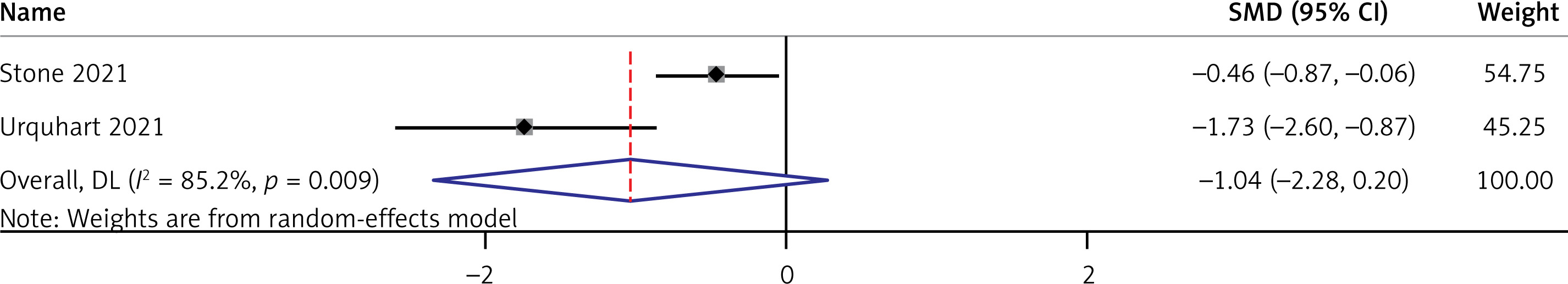 Separate analysis including only ruptured ectopic pregnancy patients revealed that the pooled SMD was –1.110 (95% CI: –2.203 to –0.017), with a significant overall effect of p = 0.046 (Figure 8). This indicates that the POCUS is beneficial in terms of time to operating room for at least ruptured ectopic pregnancy patients. Additional prediction interval estimation, sensitivity analysis, and publication bias assessment could not be performed for this outcome due to inclusion of only two studies for analysis.