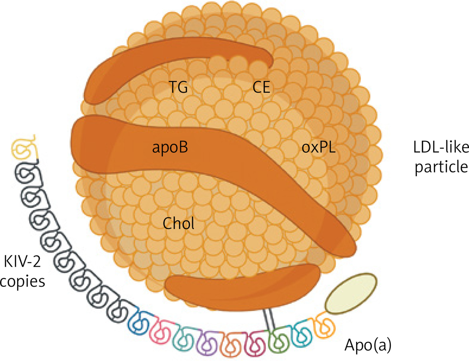 Apo – apolipoprotein, CE – cholesterol esters, Chol – cholesterol, KIV-2 – kringle IV domain type 2, LDL – low-density lipoprotein, oxPL – oxidized phospholipids, TG – triglycerides.