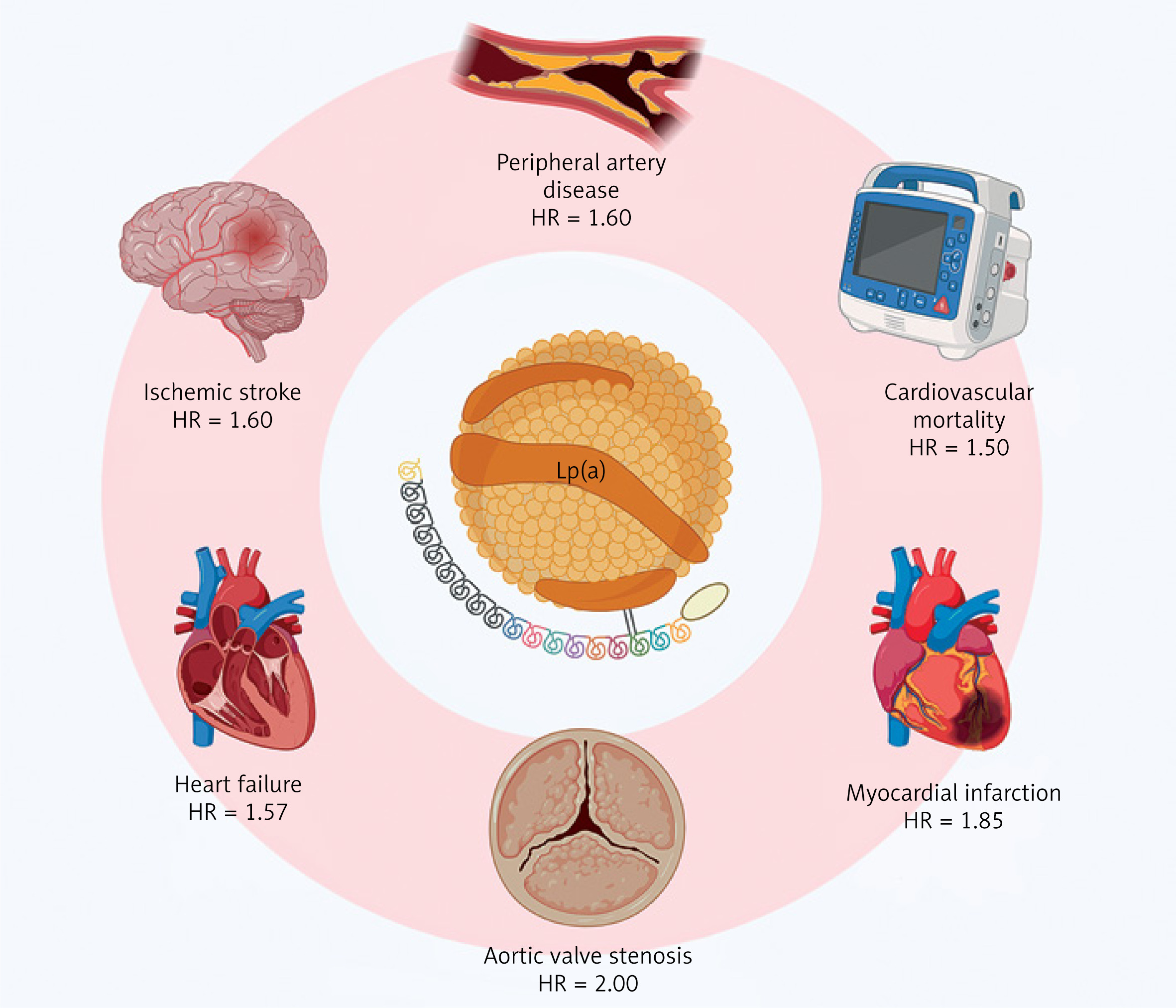 Considering other clinical entities, genetically determined high Lp(a) contributes to aortic valve calcification and stenosis [63, 64]. In a meta-analysis comprising 710 patients with AS, the progression of peak aortic jet velocity and mean transvalvular gradient was accelerated by 41% and 57%, respectively, in those at the top compared to the bottom Lp(a) tertile [65]. Absolute risk driven by elevated Lp(a) seems the most pronounced for MI and AS [66]. Nonetheless, a causal relationship was also found between increased Lp(a), peripheral artery disease (PAD), and major adverse leg events (HR = 2.99 and rate ratio = 3.04, respectively) [67]. Moreover, large meta-analyses reported a significant association between elevated Lp(a) and ischemic stroke (standardized mean differences 0.76), as well as stroke recurrence and poor functional outcomes (odds ratio [OR] = 1.69 and OR = 2.09, respectively) [68, 69].