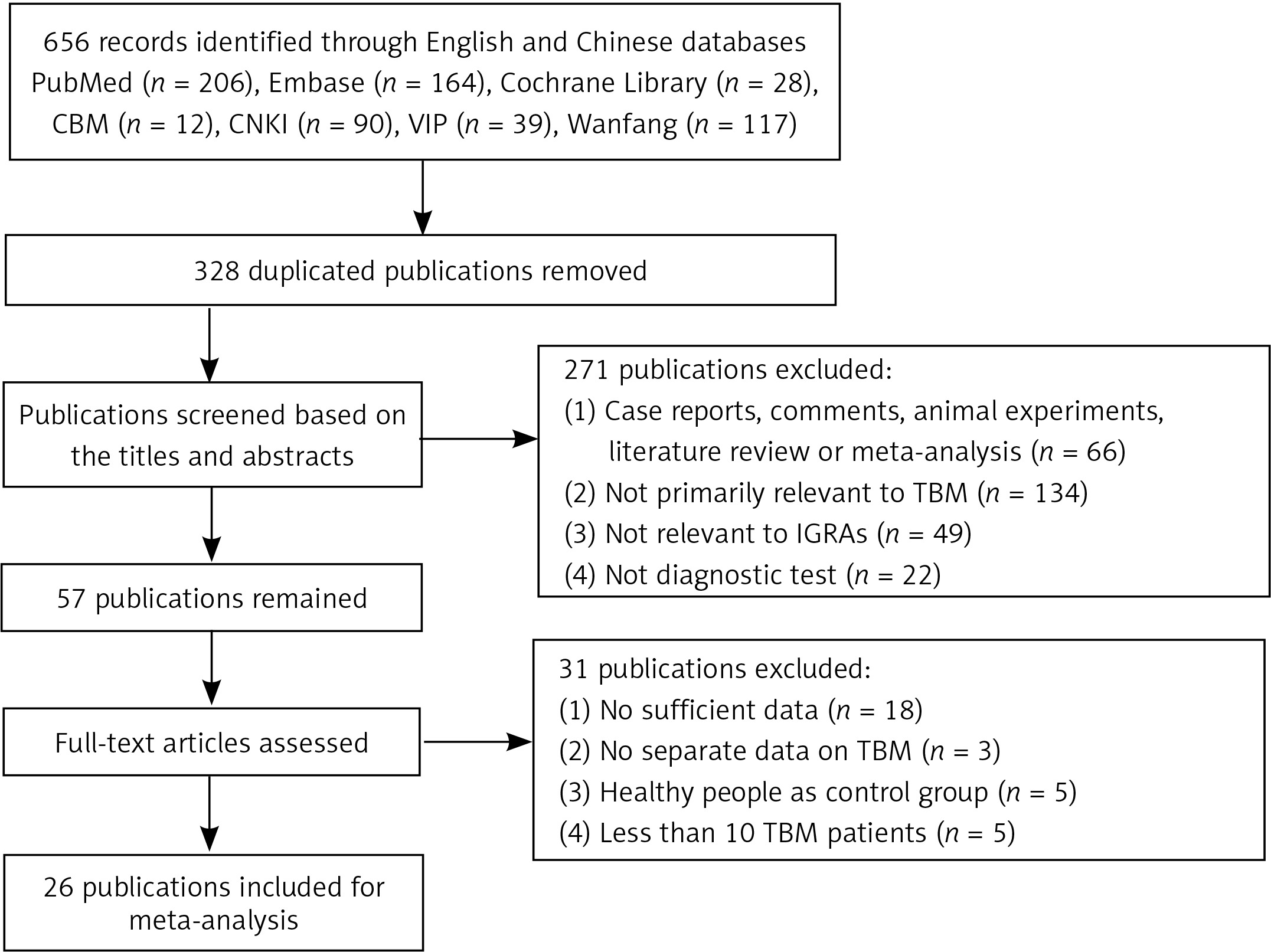 Published studies were systematically collected by searching PubMed, Embase, Cochrane Library, Chinese Biomedical Literature Database (CBM), China National Knowledge Infrastructure (CNKI), China Science and Technology Journal (VIP) and Wanfang databases. The combination of key words was as follows: (tuberculous meningitis, or tuberculosis, meningeal, or extrapulmonary tuberculosis) and (QuantiFERON, or T-SPOT.TB, or TSPOT, or ELISPOT, or Interferon-γ assays, or Interferon-γ release assays, or IGRA, or T cell assays, or T cell response). Searching was investigated without restriction on language, as TB is more prevalent in non-English speaking countries. Reference lists were searched manually to further identify additional eligible literature.