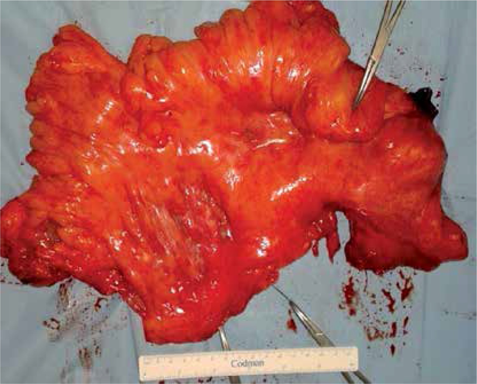 Clinical (age, gender, ASA classification, site of tumor, surgical procedure, type of surgery) and histopathological (tumor grade and stage) parameters as well as short- and long-term outcomes (morbidity, mortality, cancer-free and recurrence-free survival) were prospectively collected from a standardized database and included in our analysis. In the current analysis we did not include patients with inflammatory bowel disease and familial adenomatous polyposis. All specimens were photo documented and evaluated for surgical quality – in terms of mesocolic plane, lymph node harvesting and lymph node ratio (LNR) (Figures 1, 2). Clinical and histopathological characteristics are presented in Table I.