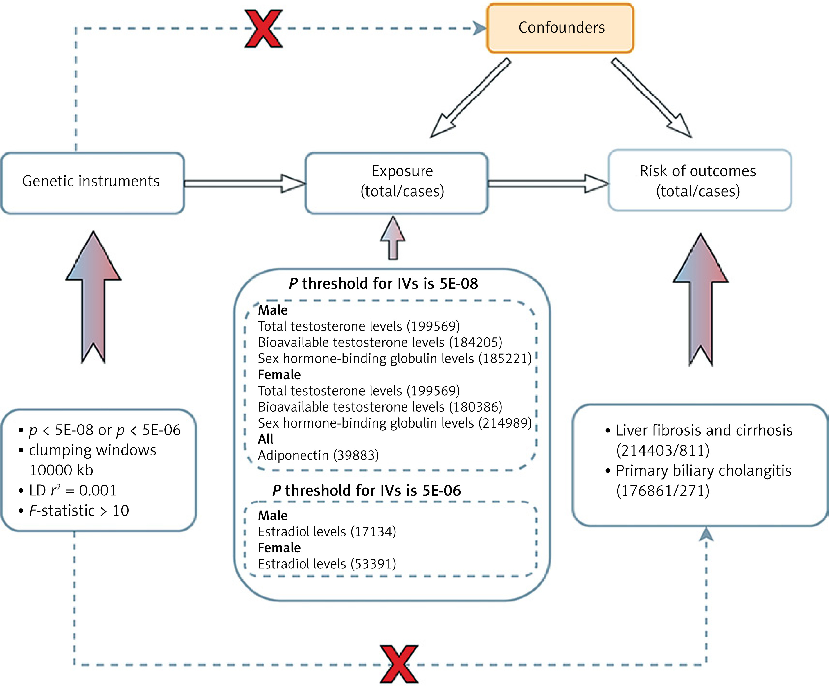 Previous observational studies may have been influenced by unavoidable confounding factors and limited sample size, making it difficult to establish causation [16]. Therefore, the causal association between sex hormones, adiponectin and the risk of liver fibrosis and cirrhosis remains uncertain and requires additional investigation. Mendelian randomization (MR) is an epidemiological method widely used in various clinical research, utilizing single nucleotide polymorphisms (SNP) as instrumental variables (IVs) to establish the causal relationship between exposure and outcome [16]. In the present study, we investigated the potential causal effects of sex hormones and adiponectin on the risk of fibrosis, cirrhosis, and primary biliary cirrhosis (PBC: a subtype of cirrhosis) by gender, aiming to provide a relevant research basis for elucidating the mechanism of liver fibrosis and cirrhosis and identifying new therapeutic targets [11, 17].