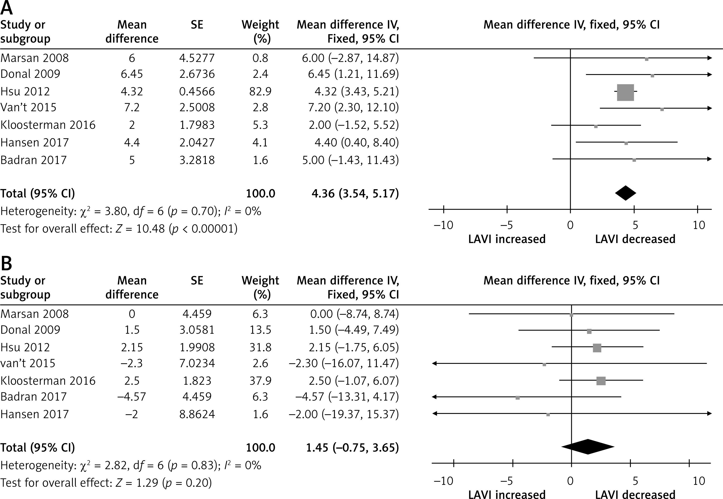 The meta-regression analysis showed that the percentage mean change of LAVI was related to changes of LVESV (β = –1.02 (–1.46 to –0.58), p < 0.001, t = 0, I2 = 0, Q = 1.28, df = 4) and LVEF (β = 2.02 (1.86–4.58), p = 0.001, t = 18, I2 = 68, Q = 54, df = 5). The decreased LVESV and/or increased LVEF were associated with LAVI reduction (Figures 3 A, B). The heterogeneity across the included studies was assessed for the analysis of the association of LAVI with LVEF, using the random effect on meta-regression.