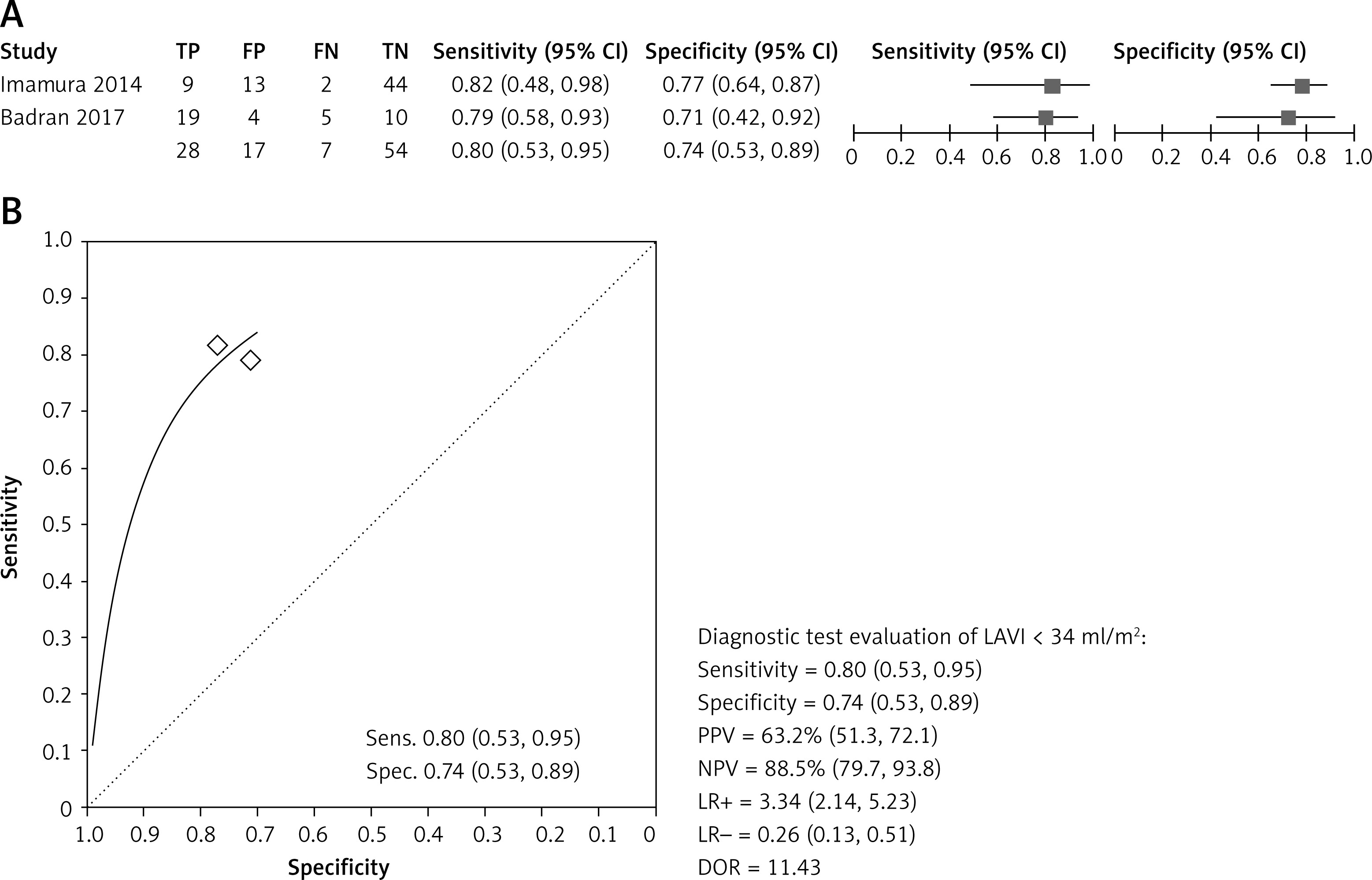 Based on available evidence, the baseline cut-off of LAVI < 34 ml/m2 accurately predicted CRT response with summary sensitivity of 0.80% (0.53–0.95), summary specificity 0.74% (0.53–0.89), PPV = 63.2%, NPV = 85.5%, LR+ = 3.34, LR– = 0.26, and Diagnostic OR > 11 (Figure 4).