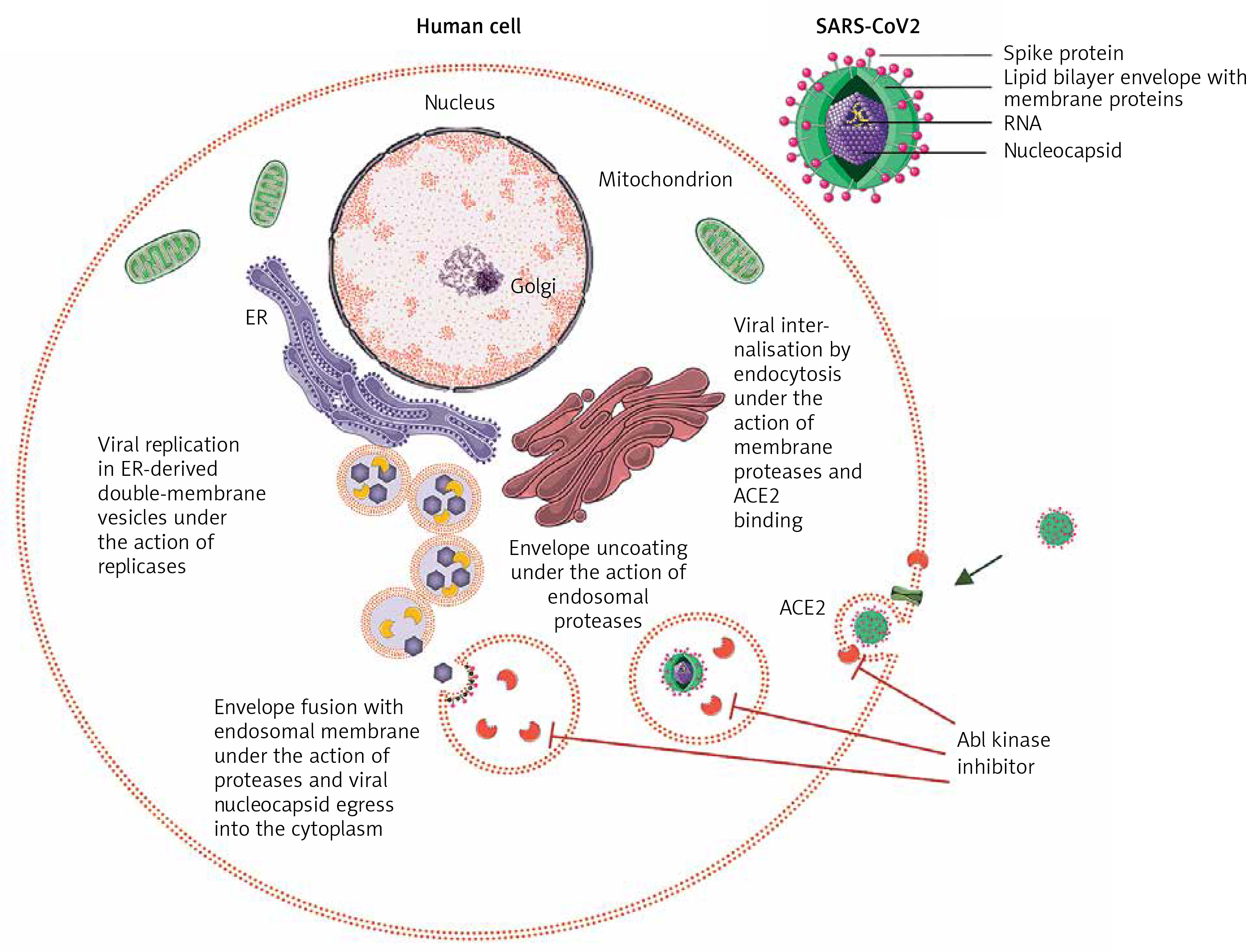 Abl kinase inhibition of early entry phases in the viral infectious cycle of SARS-CoV2. Upon binding of SARS-CoV2 spike protein to ACE2, the action of proteases at the cell membrane and in the endosomal compartment is required to complete the subsequent fusion steps of the virus. Abl kinase inhibitors act on proteases required for the completion of these steps by blocking their activity in SARS-CoV and MERS-CoV infection in vitro, and a similar activity of proteases is seen in SARS-CoV2
