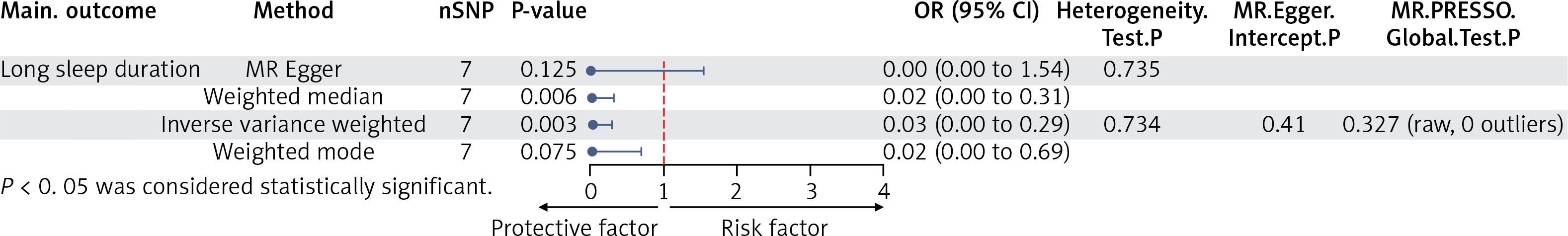 Following the Bonferroni correction, long sleep duration was the only phenotype showing a causal association with endometriosis in the IVW model (Supplementary Figure S1, Supplementary Table SVI). Specifically, long sleep duration (odds ratio: 0.03; 95% confidence interval: 2.77e-03–0.29; p = 0.003) was associated with a reduced risk of endometriosis. Smoking cessation showed a protective trend (odds ratio: 0.58; 95% confidence interval: 0.37–0.91; p = 0.038), but it did not meet the corrected significance threshold (p < 4 × 10−3). Therefore, this association was considered suggestive, indicating preliminary evidence, which warrants further validation.