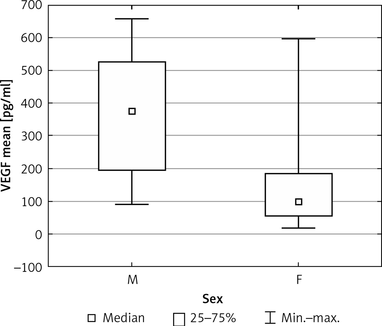 Mean BDNF blood levels were significantly higher in the studied group than in the healthy subjects (171.57 vs. 64.04 pg/ml, p = 0.012) (Figure 1). In the sex-matched subgroups we found mean VEGF blood levels to be significantly higher among boys with headaches than in the group of girls (368.27 vs. 142.86 pg/ml, p = 0.011) (Figure 2). There were no significant differences in levels of VEGF, sCD40L or PAI-1 between groups.