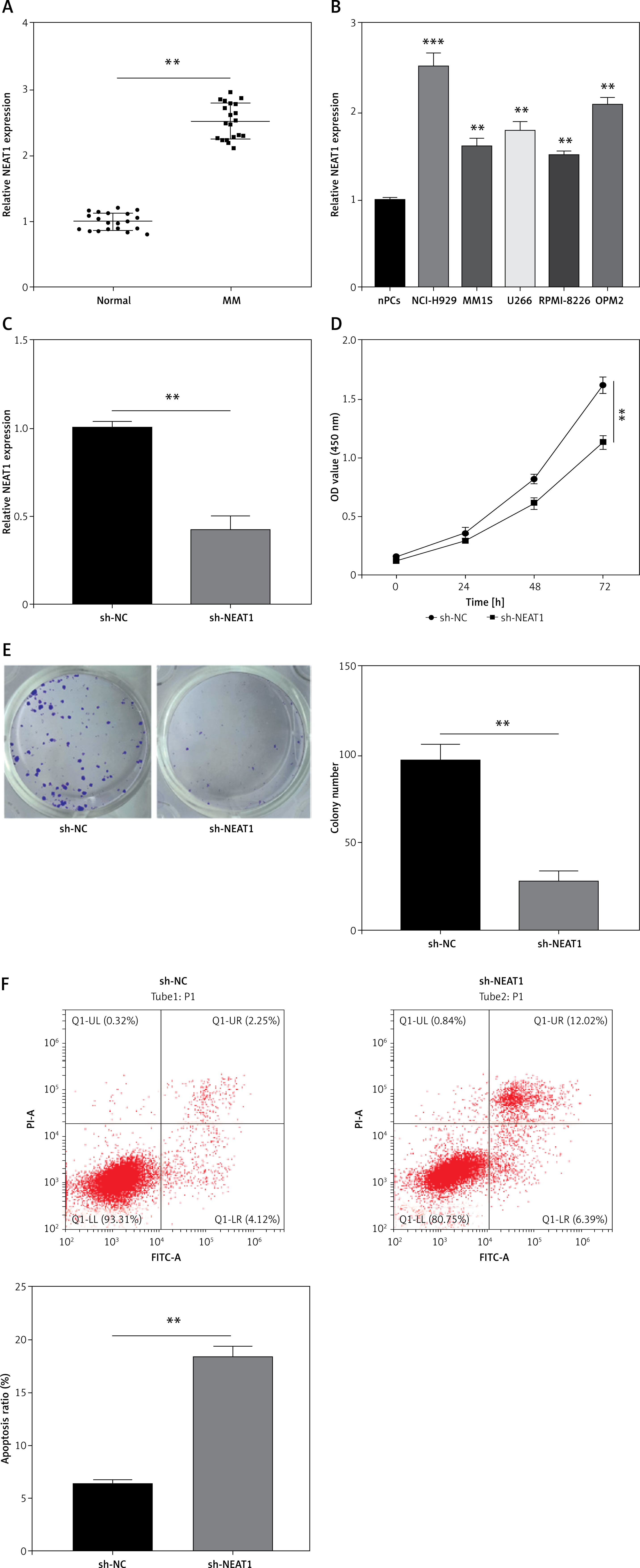 Effects of NEAT1 knockdown on MM cell growth. A – NEAT1 expression in the bone marrow specimens from MM patients and healthy normal donors was measured by qRT-PCR. B – qRT-PCR was used to examine NEAT1 expression in MM cells and nPCs cells. C–F – NCl-H929 cells were transfected with sh-NC or sh-NEAT1. C – NEAT1 expression was detected by qRT-PCR. D – CCK-8 assay was used to assess cell viability. E – Soft-agar colony formation assay was performed to evaluate colony numbers. **p < 0.01, ***p < 0.001. F – Flow cytometry was utilized to determine the cell apoptosis rate. The cell experiment was repeated 3 times. **p < 0.01, ***p < 0.001.