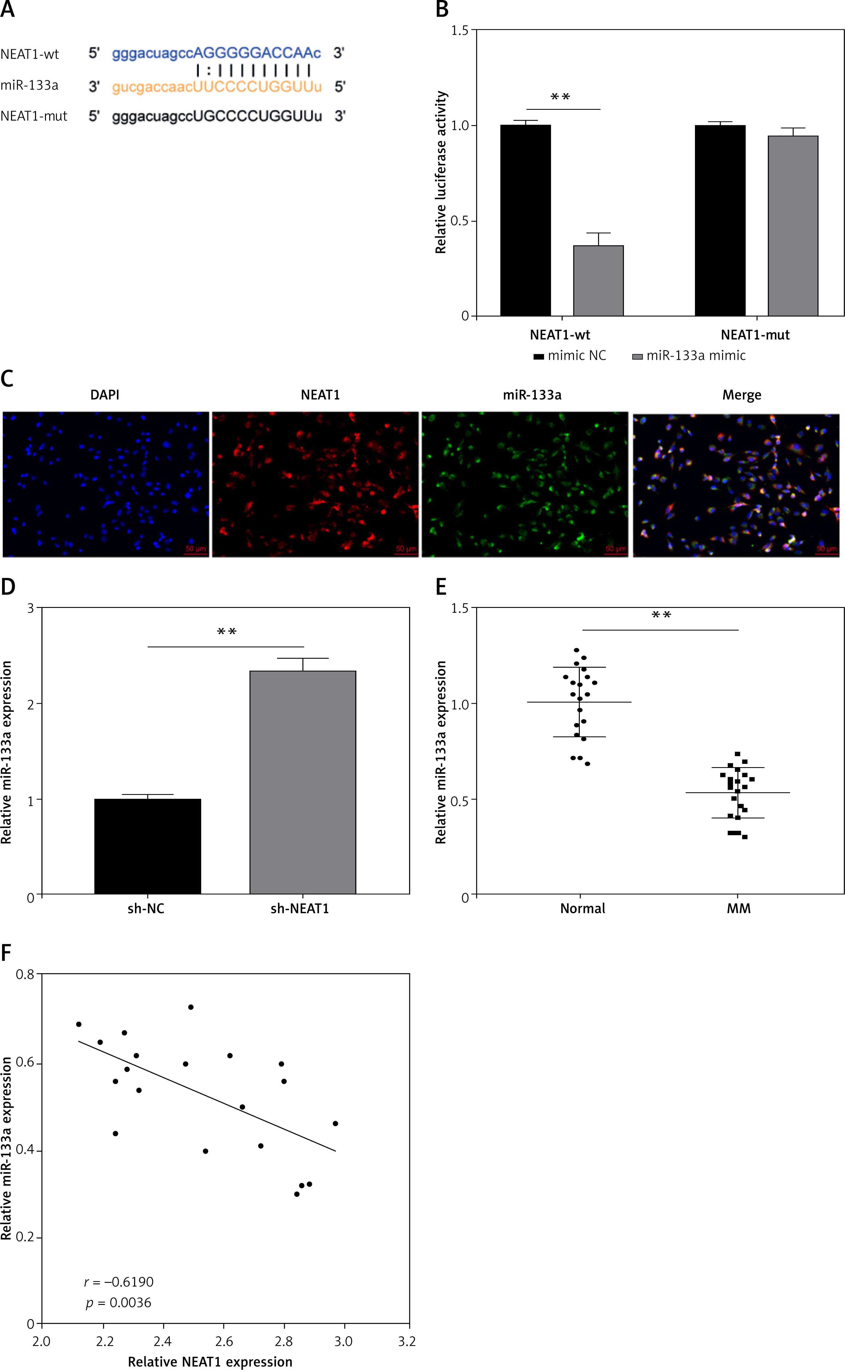 NEAT1 served as miR-133a sponge in MM. A – The sequences of NEAT1-wt and NEAT1-mut are shown. B – Dual-luciferase reporter assay was used to confirm the interaction between NEAT1 and miR-133a. C – FISH assay demonstrated the co-localization of NEAT1 and miR-133a in NCl-H929 cells. D – qRT-PCR was performed to examine miR-133a expression in NCl-H929 cells transfected with sh-NC or sh-NEAT1. E – MiR-133a expression was measured by qRT-PCR in the bone marrow specimens from MM patients and healthy normal donors. F – Pearson correlation analysis was used to examine the correlation between NEAT1 and miR-133a expression in the bone marrow specimens from MM patients. The cell experiment was repeated 3 times. **p < 0.01