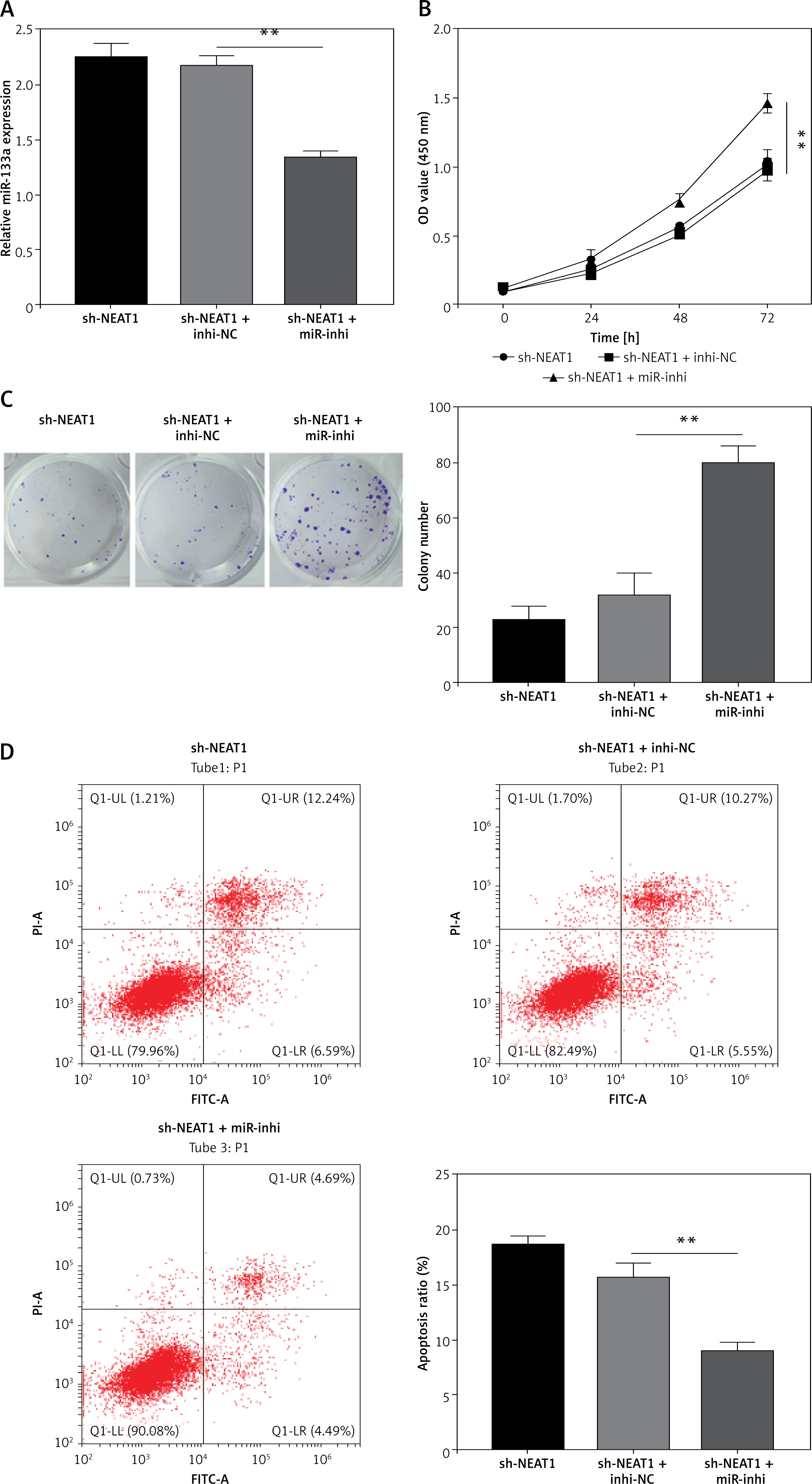 Effects of sh-NEAT1 and miR-133a-inhi on MM cell growth. NCl-H929 cells were transfected with sh-NEAT1, sh-NEAT1 + inhi-NC or sh-NEAT1 + miR-inhi. A – MiR-133a expression was detected by qRT-PCR. B – Cell viability was examined by CCK-8 assay. C – Colony numbers were determined by soft-agar colony formation assay. D – Cell apoptosis rate was analyzed by flow cytometry. The cell experiment was repeated 3 times. **p < 0.01