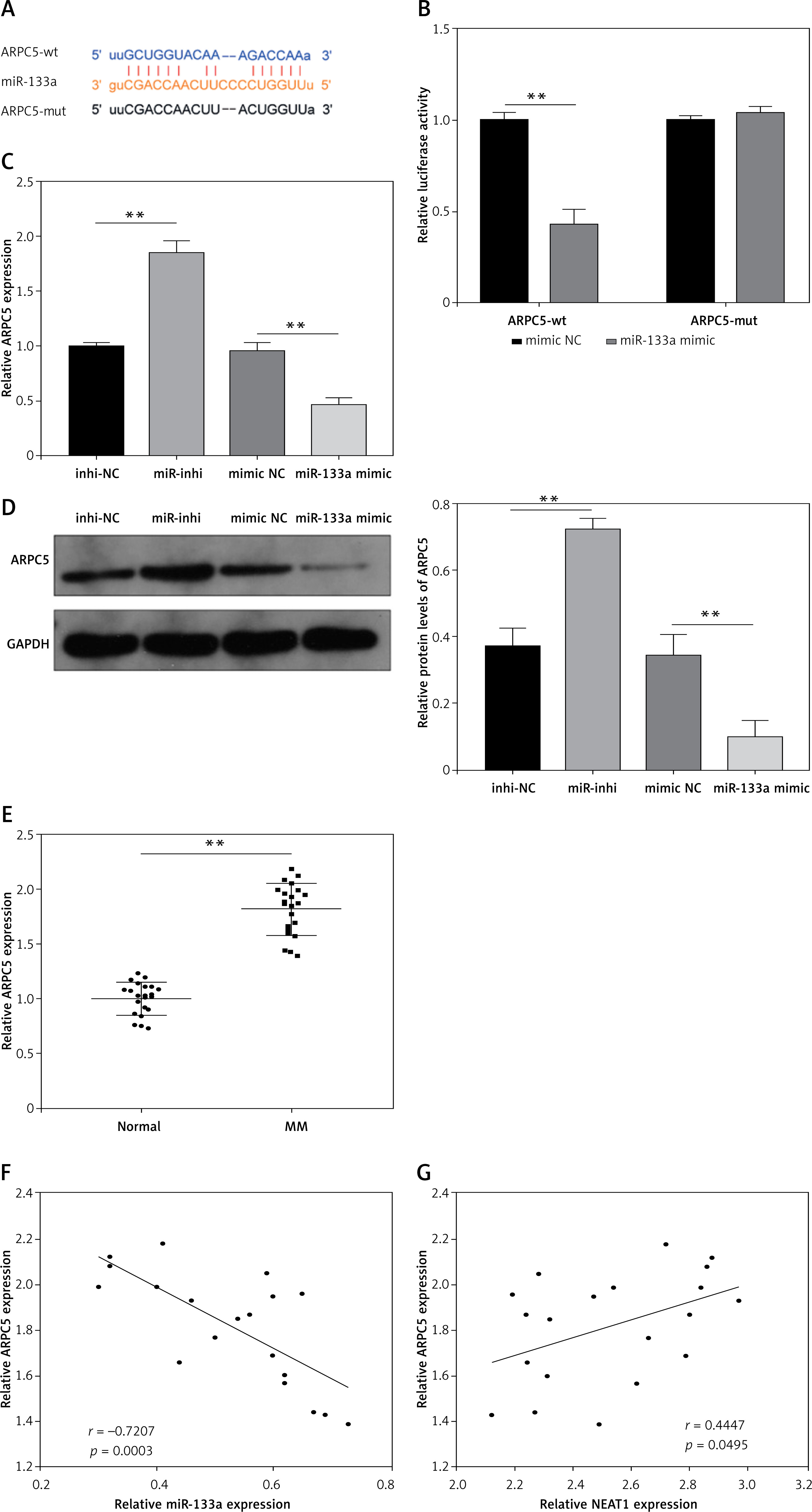 ARPC5 was targeted by miR-133a in MM. A – The sequences of ARPC5-wt and ARPC5-mut are presented. B – Dual-luciferase reporter assay was performed to confirm the interaction between miR-133a and ARPC5. C, D – qRT-PCR and western blot analysis were used to examine ARPC5 mRNA and protein expression in NCl-H929 cells transfected with miR-inhi or miR-133a mimic. E – ARPC5 expression was detected by qRT-PCR in the bone marrow specimens from MM patients and healthy normal donors. **p < 0.01. F, G – Pearson correlation analysis was employed to analyze the correlation between ARPC5 and miR-133a or NEAT1 expression in the bone marrow specimens from MM patients. The cell experiment was repeated 3 times. **p < 0.01