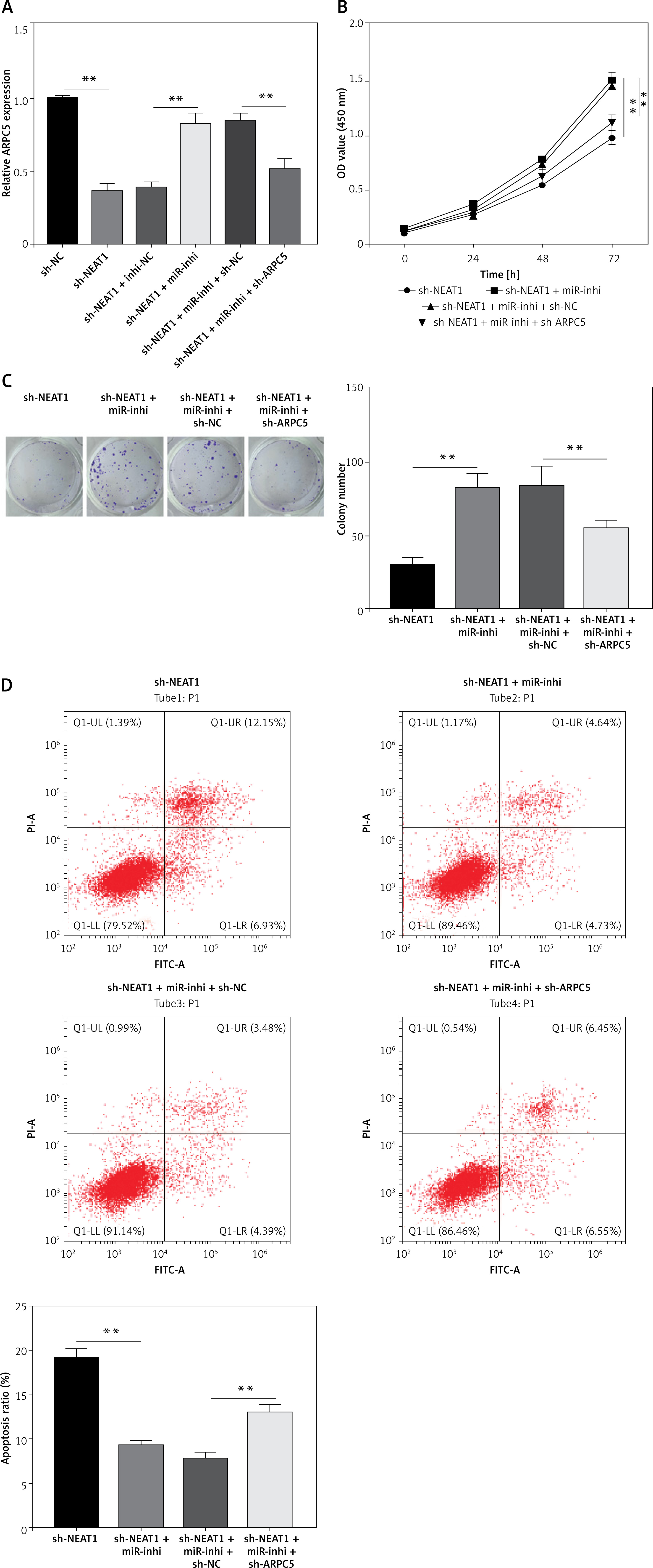 NEAT1 affects MM cell growth by regulating miR-133a/ARPC5 axis. NCl-H929 cells were transfected with sh-NC, sh-NEAT1, sh-NEAT1 + inhi-NC, sh-NEAT1 + miR-inhi, sh-NEAT1 + miR-inhi + sh-NC or sh-NEAT1 + miR-inhi + sh-ARPC5. A – ARPC5 expression was detected by qRT-PCR. B – CCK-8 assay was employed to assess cell viability. C – Colony numbers were detected using soft-agar colony formation assay. **p < 0.01. D – Flow cytometry was used to determine the cell apoptosis rate. The cell experiment was repeated 3 times. **p < 0.01.