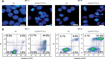 Next, PTCSC3 was overexpressed in SCC-1 and SCC-9 oral cancer cells to gain insights about its functionality. The overexpression of PTCSC3 was authenticated by qRT-PCR analysis; it should about a 6.7- and 6.3-fold increase in PTCSC3 expression in SCC-1 and SCC-9 cells respectively (Figure 2 A). The results of the cell viability assay showed that overexpression of PTCSC3 resulted in a significant decline in the proliferation of the SCC-1 and SCC-9 cells (Figure 2 B). The DAPI staining analysis showed that PTCSC3 overexpression triggers changes in the nuclear morphology of the SCC-1 and SCC-9 cells such as nuclear blebbing and fragmentation indicative of apoptosis (Figure 3 A). The annexin V/PI staining assays showed that the early and late apoptosis increased from 3.8% and 4.0% to 44.9% and 41.2% respectively, upon overexpression of PTCSC3 in SCC-1 cells. In case of SCC-9 cells, early and late apoptosis increased from 4.5% and 9.6% to 12.9% and 41.4% respectively upon PTCSC3 overexpression (Figure 3 B). The expression of Bax and Bcl-2 was evaluated in the NC and pcDNA-PTCSC3 transfected SCC-1 and SCC-9 cells. The results revealed remarkable enhancement of Bax and suppression of Bcl-2 in both the cell lines, further confirming the induction of apoptotic cell death (Figure 4).