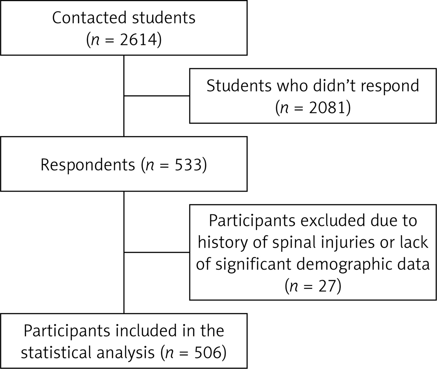 A total of 533 surveys were received, yielding a response rate of 20.39% (533/2614). Among these, 506 surveys were included in the statistical analysis (Figure 1). Twenty-seven cases were excluded because they either reported history of spine trauma (7 cases), or had missing demographic data, such as study profile, year of study, sex, age, weight, or height (20 cases).