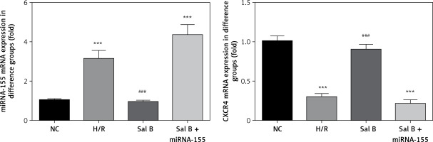 Compared with the NC group, the expression of the miRNA-155 gene was significantly higher in the H/R group and Sal B + miRNA-155 group, while the expression of the CXCR4 gene was significantly lower (p < 0.001, Figure 6). However, compared with the H/R group, the expression of the miRNA-155 gene was significantly lower in the Sal group, while the expression of the CXCR4 gene was significantly higher (p < 0.001, Figure 6).