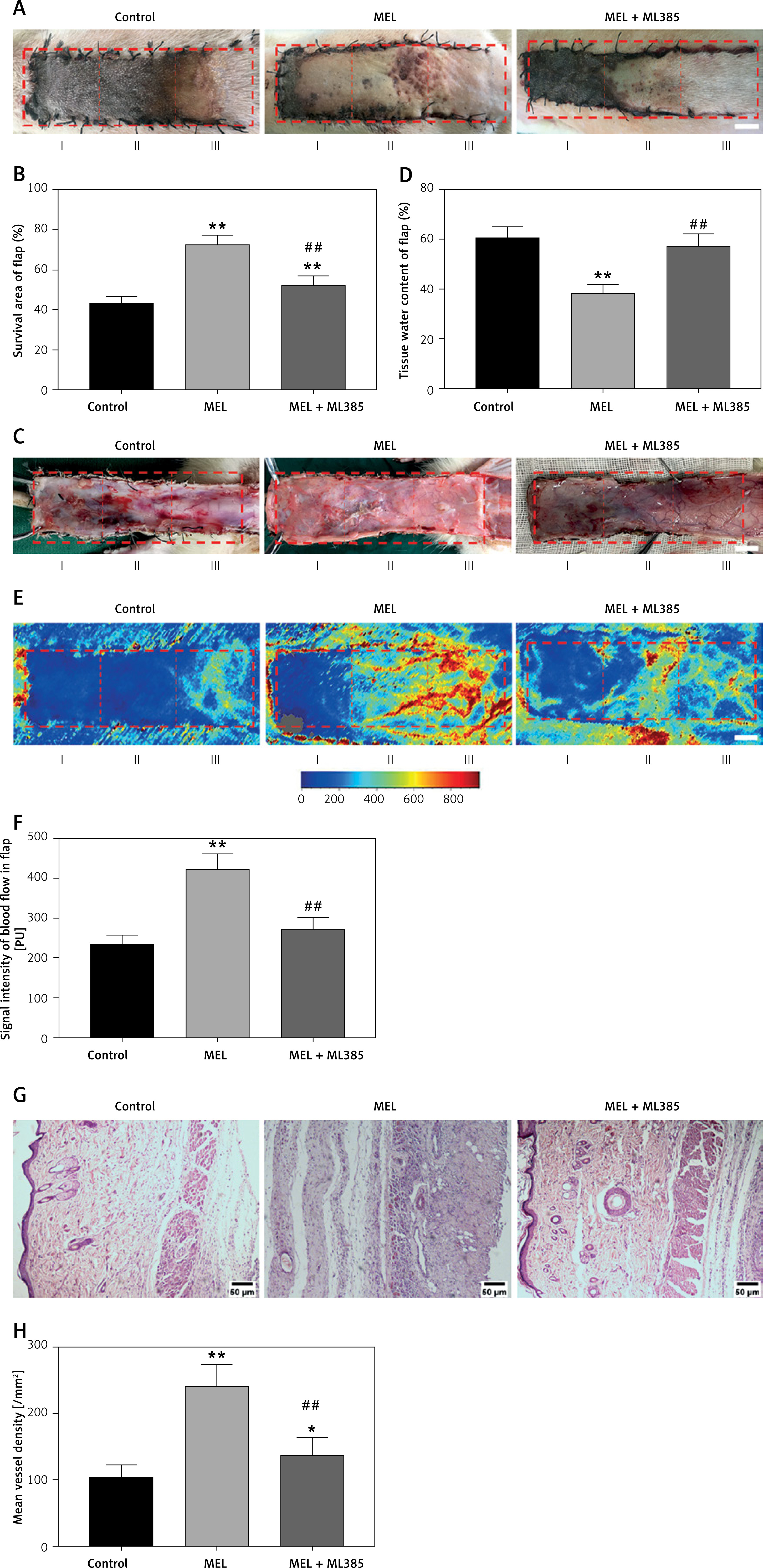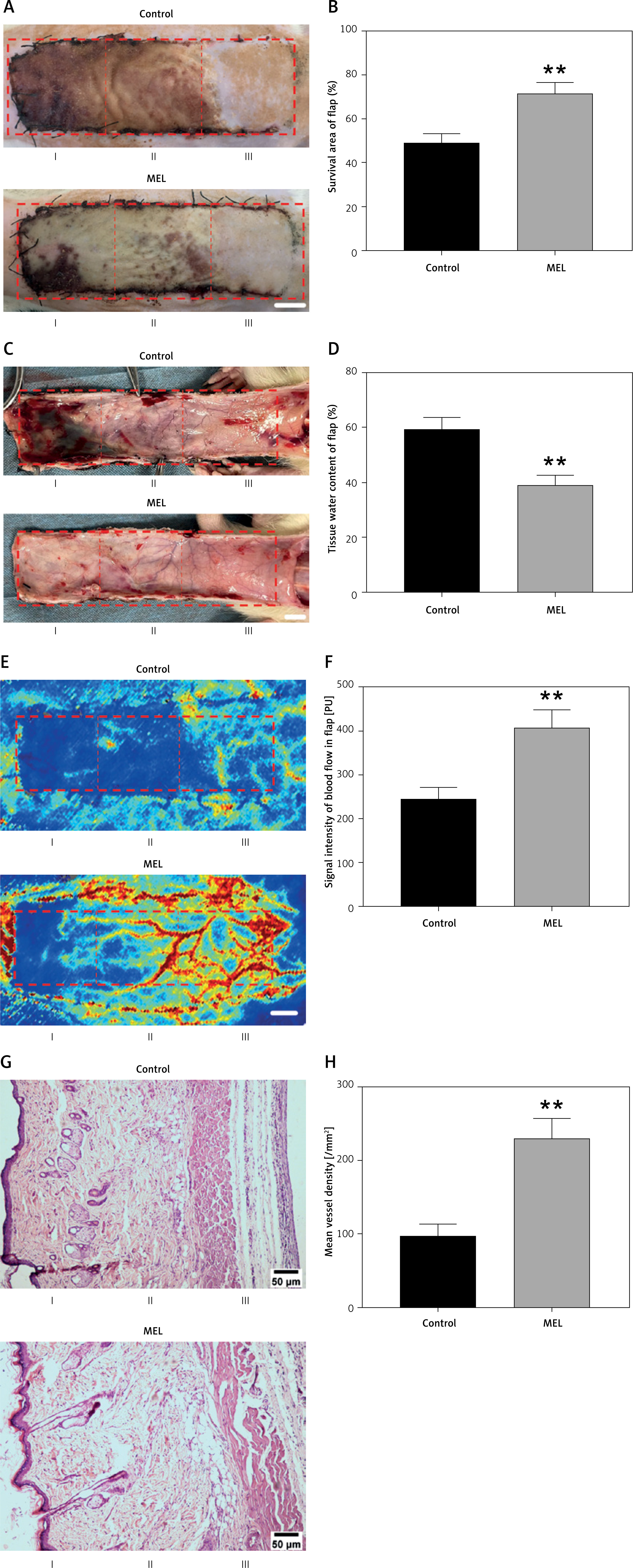 Melatonin promotes survival of random skin flaps. A – Digital photographs of random skin flaps in the Control and MEL groups were taken on postoperative day 7 (scale bar: 1.0 cm). B – Histogram of percentage of survival area on postoperative day 7. C – Digital photographs of tissue edema in the Control and MEL groups on postoperative day 7 (scale bar: 1.0 cm). D – Histogram of percentage of tissue water content. Data are presented as mean ± SD, n = 6 per group. E – Laser Doppler blood flow images of flaps showing vascular network and blood supply in the Control and MEL groups on postoperative day 7 (scale bar: 1.0 cm). F – Histogram of signal intensity of blood flow in flaps. G – HE staining in Area II of flaps showing the vessels in the Control and MEL groups (original magnification × 200) (scale bar: 50 μm). H – Histogram of mean vessel density calculated from HE staining. Data are presented as mean ± SD, n = 6 per group. *p < 0.05 and **p < 0.01, vs. Control group
