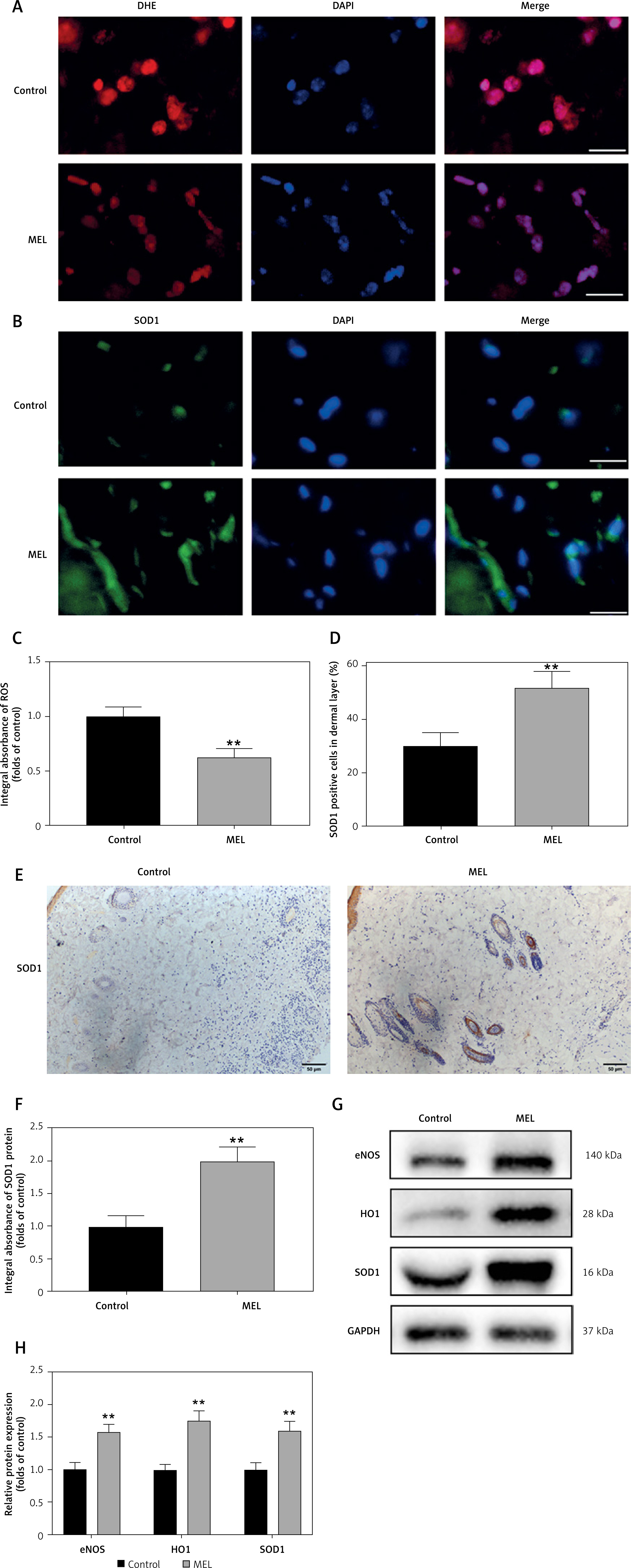 Melatonin reduces oxidative stress in random skin flaps. A, B – Immunofluorescence staining for ROS levels and SOD1 positive cells in the dermal layer in the Control and MEL groups (scale bar: 20 μm). C – Histogram showing the levels of ROS in the Control and MEL groups. D – Histogram showing the percentages of SOD1 positive cells in the Control and MEL groups. Data are presented as mean ± SD, n = 6 per group. E – Immunohistochemistry for SOD1 expression in the flaps of the Control and MEL groups (original magnification × 200) (scale bar: 50 μm). F – Histogram showing the integral absorbance of SOD1. G – Western blotting showing the expression of eNOS, HO1 and SOD1 in the Control and MEL groups. H – Histogram showing the optical density values of eNOS, HO1 and SOD1 in the Control and MEL groups. Data are presented as mean ± SD, n = 6 per group. *p < 0.05 and **p < 0.01, vs. Control group