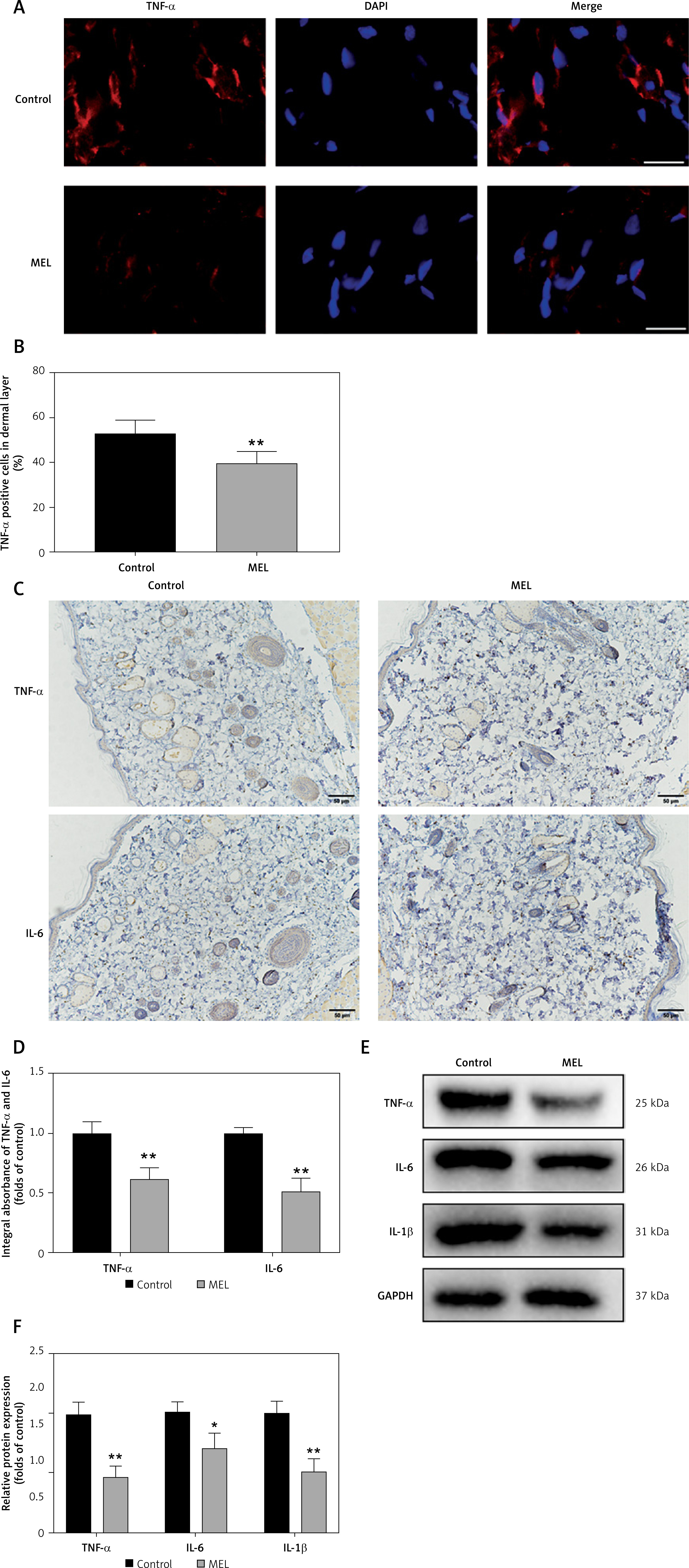 Melatonin alleviates inflammation in random skin flaps. A – Immunofluorescence staining for TNF-α positive cells in the dermal layer in the Control and MEL groups (scale bar: 20 μm). B – Histogram showing the percentages of TNF-α positive cells in the Control and MEL groups. C – Immunohistochemistry for TNF-α and IL-6 expression in the flaps of the Control and MEL groups (original magnification × 200) (scale bar: 50 μm). Data are presented as mean ± SD, n = 6 per group. D – Histogram showing the integral absorbance of TNF-α and IL-6. E – Western blotting showing the expression of TNF-α, IL-6 and IL-1β in the Control and MEL groups. F – Histogram showing the optical density values of TNF-α, IL-6 and IL-1β in the Control and MEL groups. Data are presented as mean ± SD, n = 6 per group. *p < 0.05 and **p < 0.01, vs. Control group
