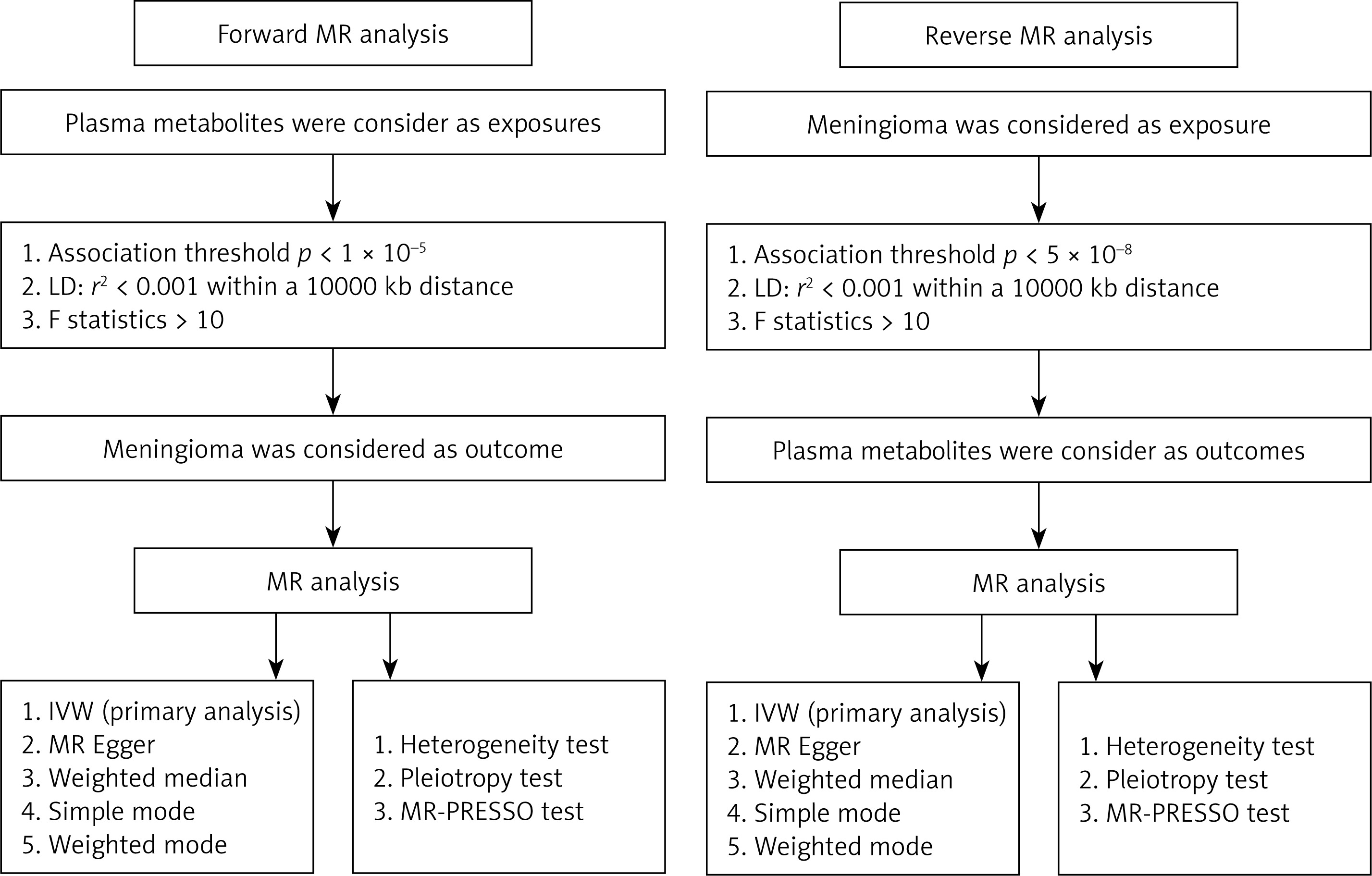 Following the three fundamental assumptions of MR analysis, we used publicly available GWAS databases to select IVs for our study. A thorough screening process was conducted to address issues of linkage disequilibrium (LD) among genetic variants and to explore the causal relationship between plasma metabolites and meningioma. This involved employing clump window sizes of r2 = 0.001 and kb = 10 000 to mitigate LD issues. Additionally, we applied a significance threshold of p < 1 × 10–5 to filter IVs strongly associated with plasma metabolites, aiming for comprehensive coverage of relevant genetic variants. Furthermore, we examined the correlation of selected IVs with potential confounding factors. The screening process for confounding factors primarily involved searching the IEU OpenGWAS project (https://gwas.mrcieu.ac.uk/) and the GWAS catalog (https://www.ebi.ac.uk/gwas/), where single nucleotide polymorphisms (SNPs) associated with factors such as age, obesity, smoking, alcohol consumption, renal dysfunction, cardiovascular diseases, medication use, and other tumors were excluded from our study to ensure the robustness and accuracy of our analysis. In the reverse MR analysis, aimed at elucidating the causal association between meningioma and plasma metabolites, we implemented a rigorous threshold of p < 5 × 10-8 to meticulously identify IVs strongly correlated with meningioma. The other screening criteria were consistent with the criteria specified above. Following this selection process, we conducted an exploration of the causal relationship between the identified IVs associated with meningioma and plasma metabolites.