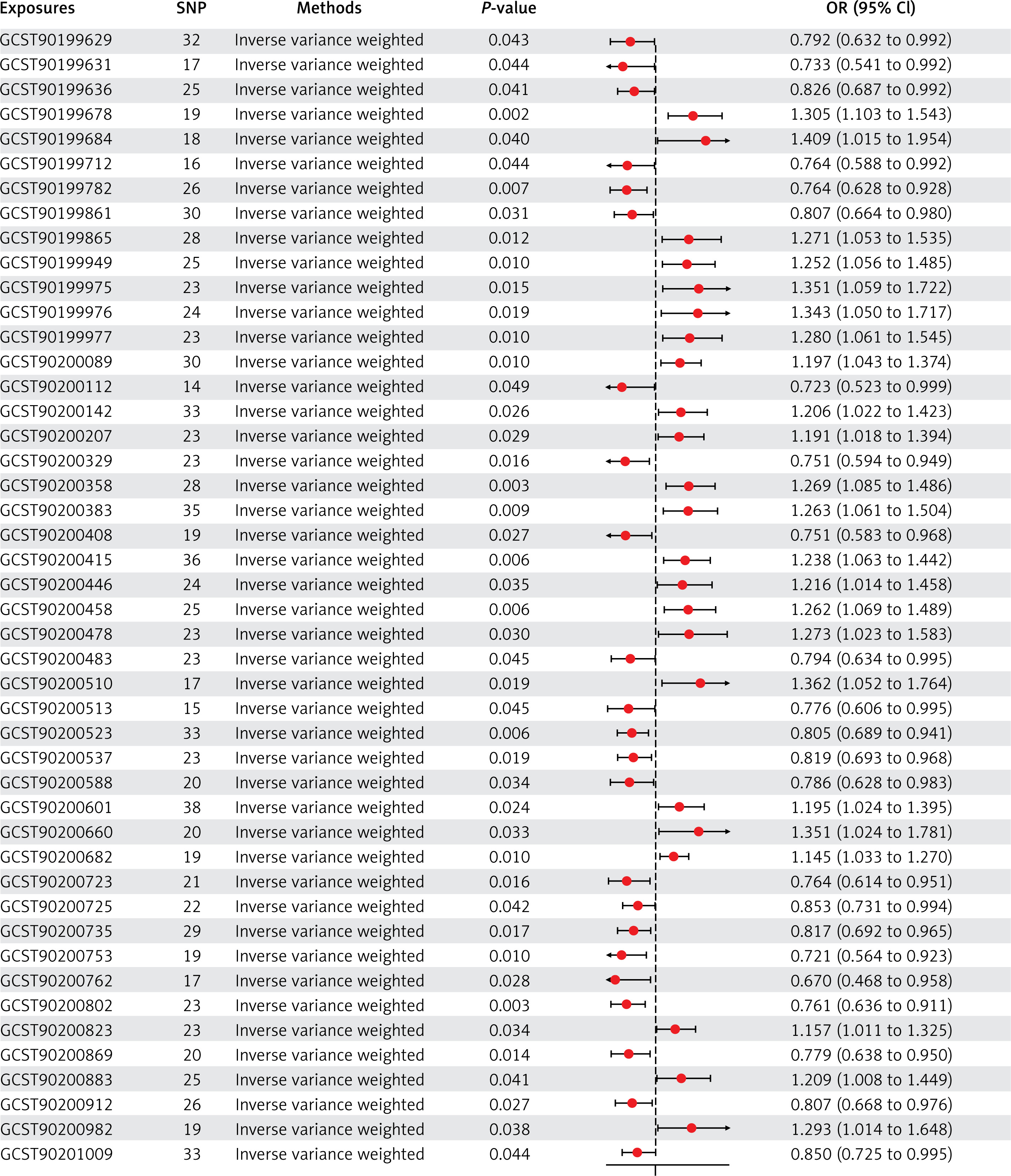 MR – Mendelian randomization, SNP – single nucleotide polymorphisms, OR – odds ratio, CI – confidence interval. GCST90199629: glycerophosphorylcholine (GPC) levels; GCST90199631: 3-methyl-2-oxovalerate levels; GCST90199636: kynurenine levels; GCST90199678: tartronate (hydroxymalonate) levels; GCST90199684: 1-linoleoylglycerol (18:2) levels; GCST90199712: 3-carboxy-4-methyl-5-propyl-2-furanpropanoate (CMPF) levels; GCST90199782: glutamine degradant levels; GCST90199861: pregnenediol sulfate (C21H34O5S) levels; GCST90199865: 2-hydroxyglutarate levels; GCST90199949: 6-oxopiperidine-2- carboxylate levels; GCST90199975: sphingomyelin (d18:2/14:0, d18:1/14:1) levels; GCST90199976: 1-dihomo-linolenylglycerol (20:3) levels; GCST90199977: 4-hydroxychlorothalonil levels; GCST90200089: methylsuccinoylcarnitine levels; GCST90200112: 2,3-dihydroxy-2-methylbutyrate levels; GCST90200142: carotene diol (1) levels; GCST90200207: methyl vanillate sulfate levels; GCST90200329: 3-phosphoglycerate levels; GCST90200358: arachidonate (20:4n6) levels; GCST90200383: cystathionine levels; GCST90200408: plasma lactate levels; GCST90200415: serine levels; GCST90200446: arachidate (20:0) levels; GCST90200458: X-11315 levels; GCST90200478: X-12221 levels; GCST90200483: X-12216 levels; GCST90200510: X-12680 levels; GCST90200513: X-13507 levels; GCST90200523: X-12844 levels; GCST90200537: X-16087 levels; GCST90200588: X-21742 levels; GCST90200601: X-23654 levels; GCST90200660: X-25957 levels; GCST90200682: 3-methylcytidine levels; GCST90200723: S-adenosylhomocysteine (SAH) to 5-methyluridine (ribothymidine) ratio; GCST90200725: adenosine 5′-diphosphate (ADP) to creatine ratio; GCST90200735: arginine to ornithine ratio; GCST90200753: aspartate to citrulline ratio; GCST90200762: palmitate (16:0) to myristate (14:0) ratio; GCST90200802: histidine to pyruvate ratio; GCST90200823: adenosine 5′-diphosphate (ADP) to N-palmitoyl-sphingosine (d18:1 to 16:0) ratio; GCST90200869: adenosine 5′-monophosphate (AMP) to valine ratio; GCST90200883: phosphate to acetoacetate ratio; GCST90200912: tryptophan to tyrosine ratio; GCST90200982: paraxanthine to linoleate (18:2n6) ratio; GCST90201009: threonine to pyruvate ratio.