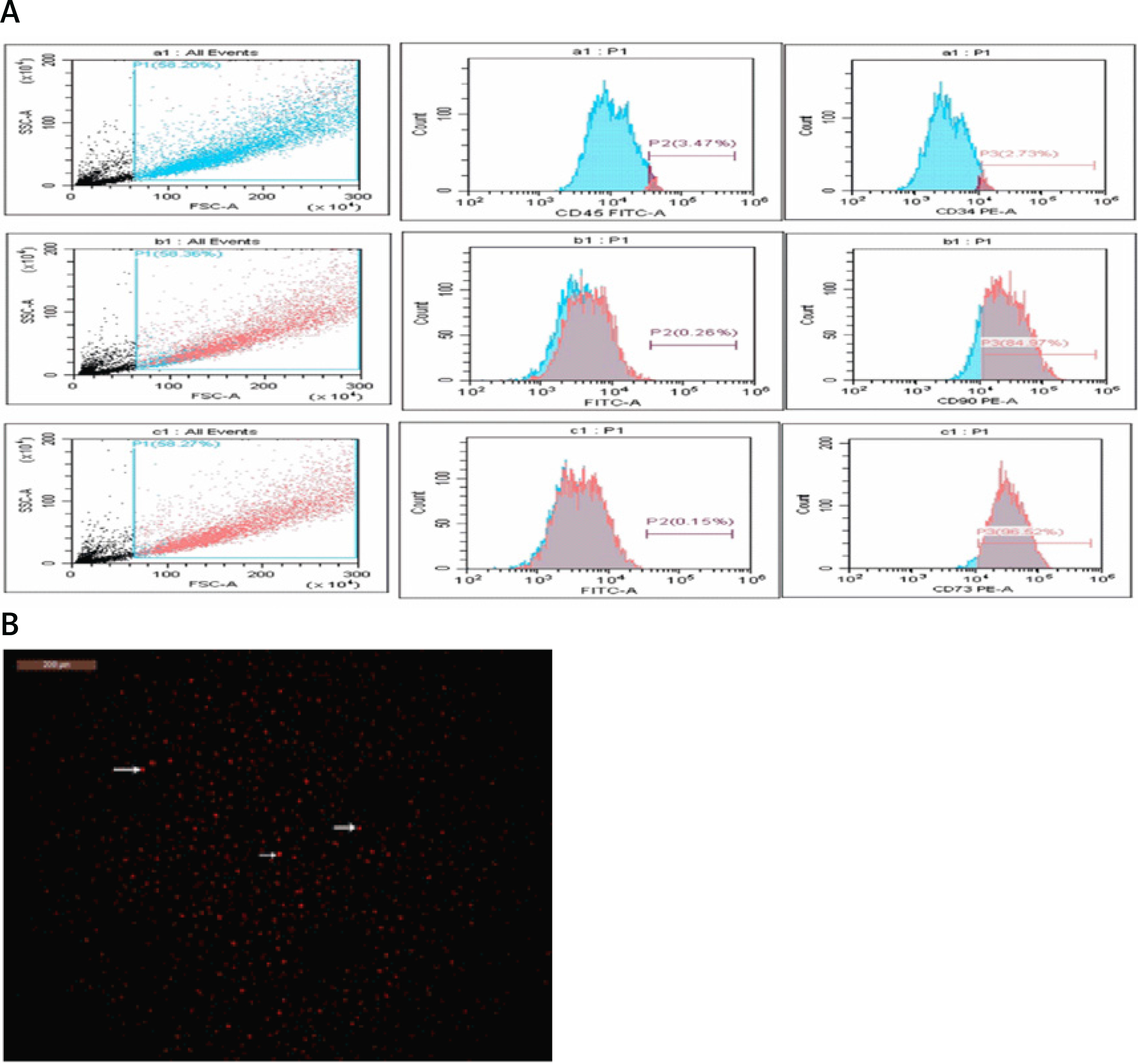 BM-MSC identification and characteristics. A – The isolated and grown MSCs were identified based on their immunological features; they were positive for CD90 and CD73 but negative for CD45 and CD34. B – BM-MSC characteristics and identification. Using a fluorescence microscope to examine cardiac tissue sections, it was possible to see that BM-MSCs labelled with PKH26 fluorescent dye had homing properties (red fluorescence)