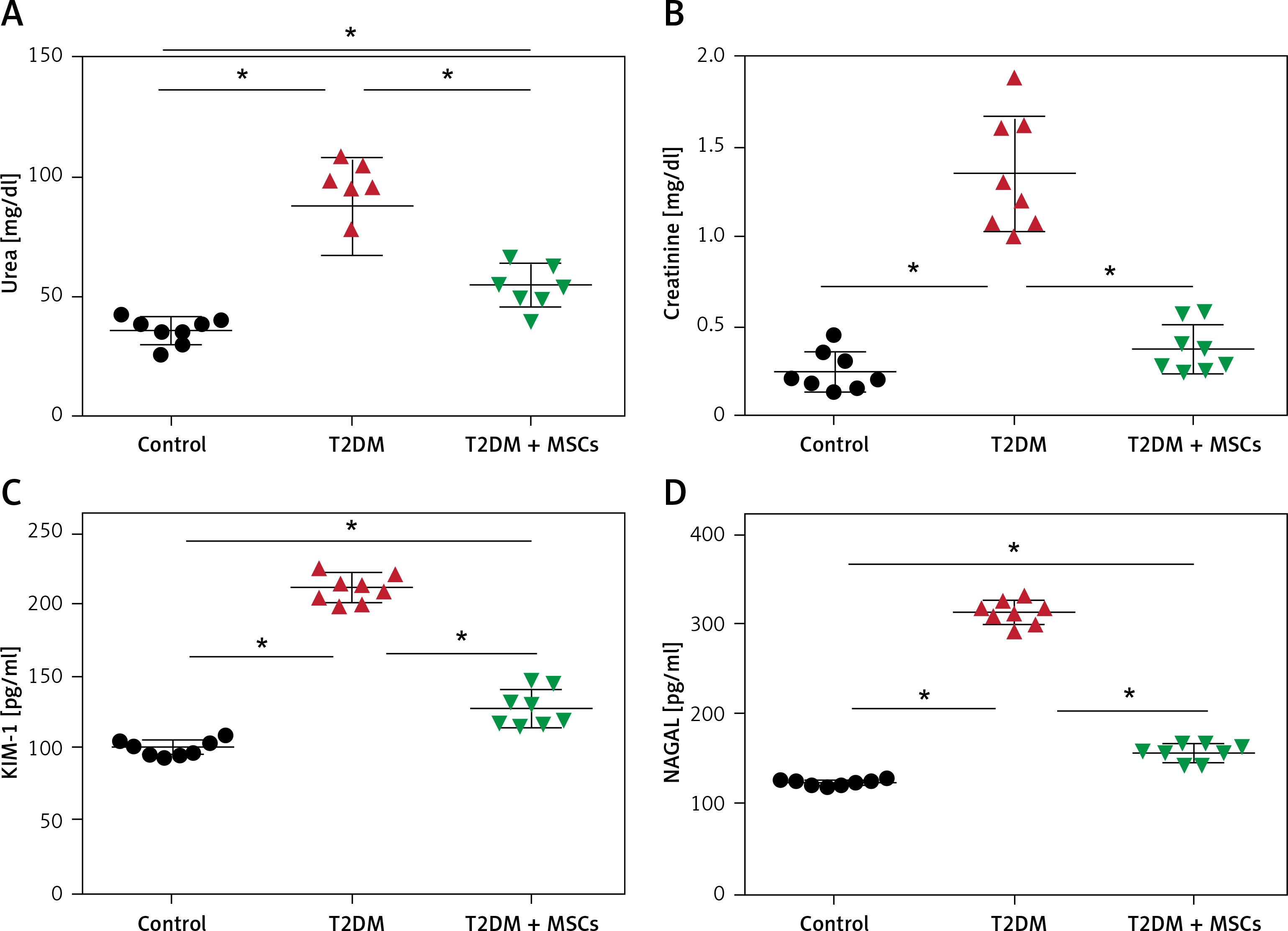 Changes in serum urea (A), creatinine (B), and the indicators of kidney injury KIM-1 (C) and NAGAL (D) in control, T2DM, T2DM + MSCs groups. The data are presented as mean ± SD*: statistically significant in comparison to the control group’s corresponding value (p < 0.0001) and statistically significant in comparison to the T2DM group’s corresponding value (p < 0.0001) (n = 8)