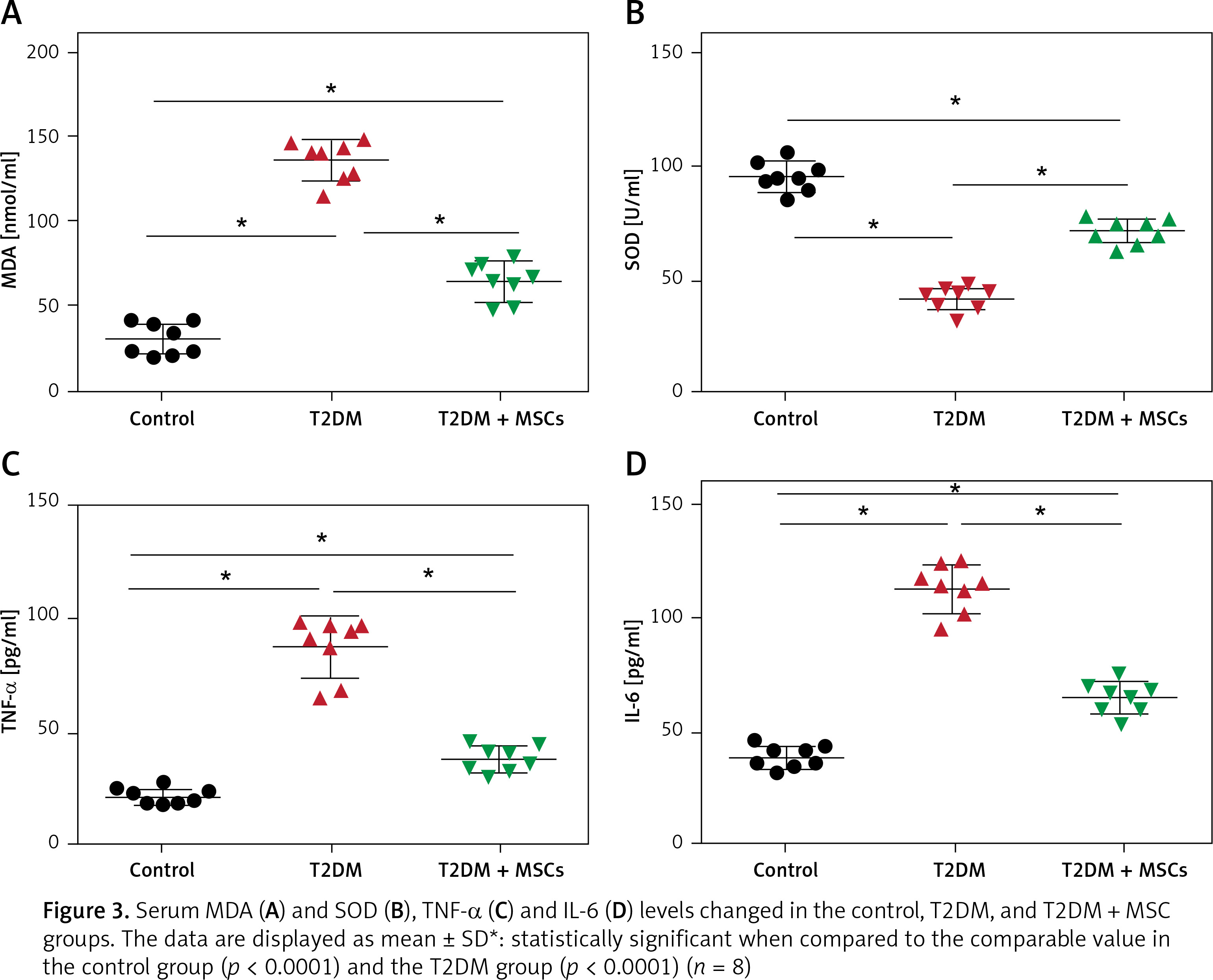 In the T2DM group, levels of MDA were significantly higher (136.7 ±11.83 mmol/ml) than in the control group (31.53 ±9.35 mmol/ml), while SOD levels were significantly lower (41.45 ±5.129 U/ml) compared to the control group (95.15 ±6.54 U/ml). However, after the administration of MSCs, there was a significant decrease in MDA levels (65.29 ±12.05 mmol/ml) and an increase in SOD levels (71.15 ±5.43 U/ml) compared to the values in the T2DM group, as shown in Figures 3 A, B. Moreover, Figures 3 C, D reveal significantly higher serum TNF (87.38 ±11.50 pg/ml) and IL-6 (113.5 ±10.53 pg/ml) in the T2DM group compared to the control group (TNF: 21.03 ±3.28 pg/ml and IL-6: 38.38 ±5.05 pg/ml, respectively). However, the administration of MSCs resulted in significantly lower TNFα (38.35 ±6.25 pg/ml) and IL-6 (64.80 ±6.86 pg/ml) levels compared to the T2DM group.