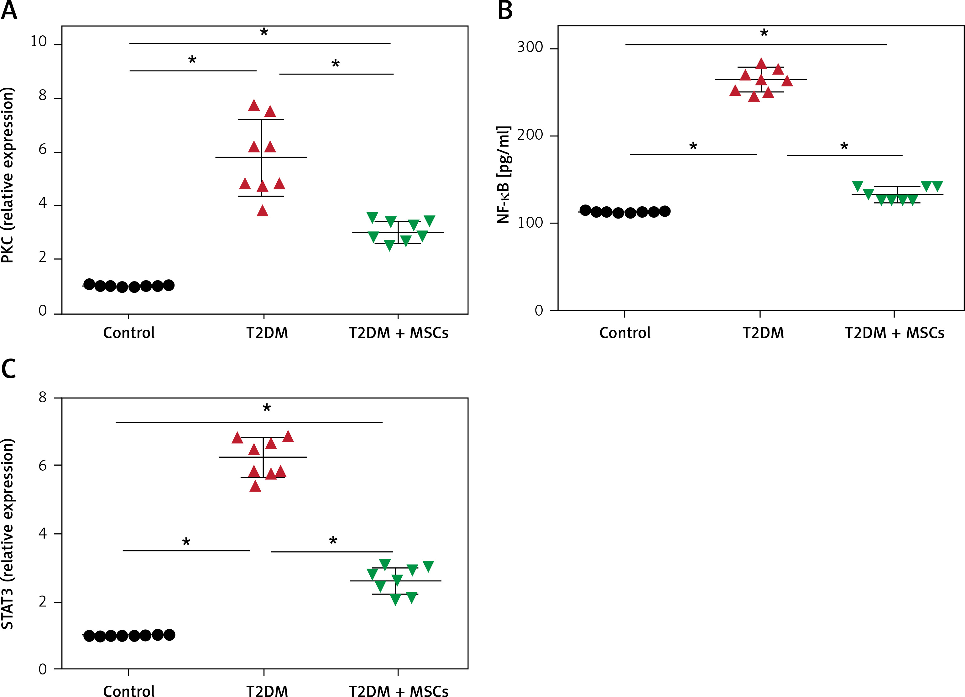 PKC (A), and STAT3 (C) levels were quantified by PCR and NF-kB (B) by ELISA in control, T2DM, and T2DM + MSCs groups. Results are displayed as mean ± SD*: statistically significant when compared to the equivalent value in the control group (p < 0.0001) and the T2DM group (p < 0.0001) (n = 8)