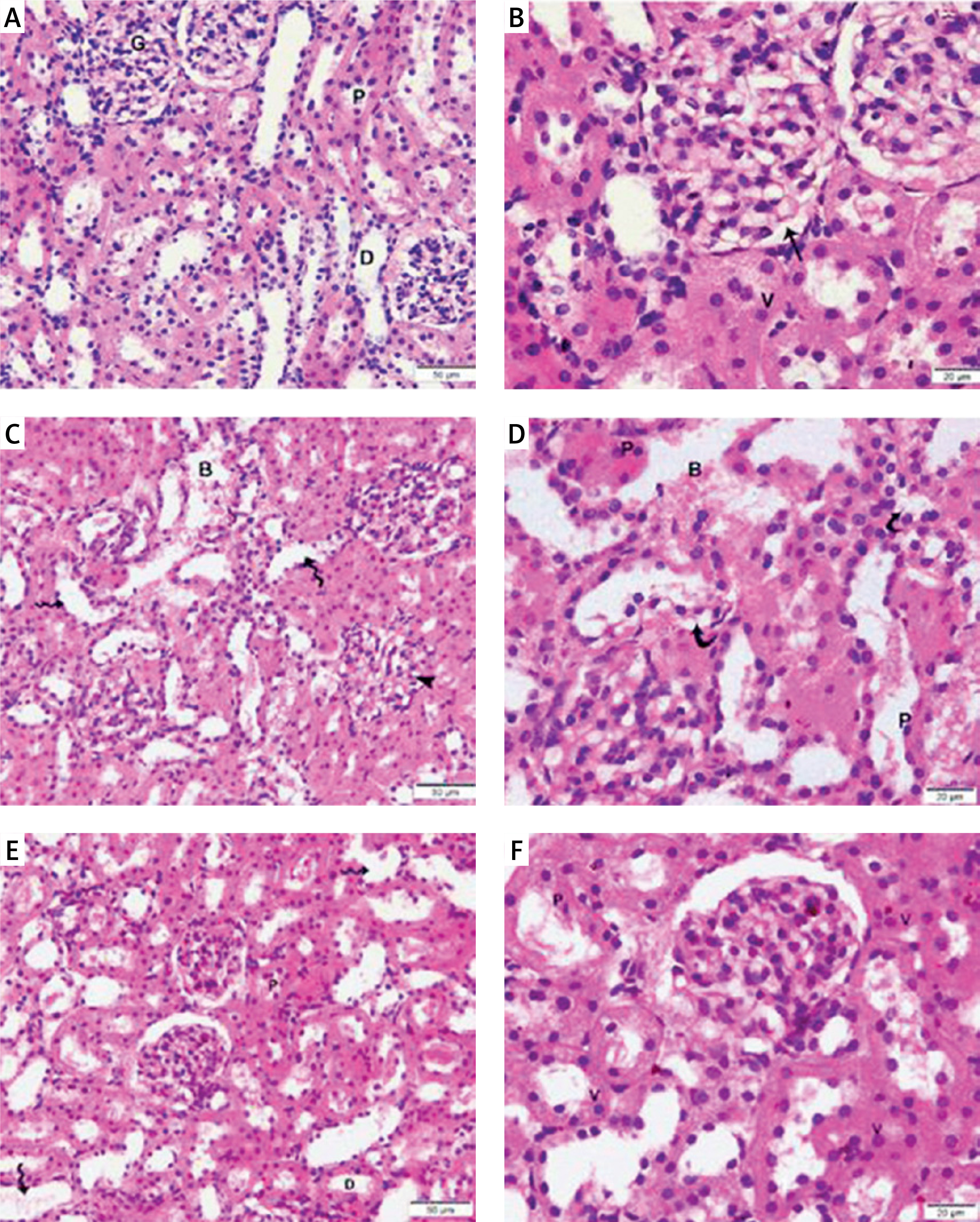 Photomicrographs of H&E-stained sections of the renal cortex. (A, B) Proximal (P) and distal (D) convoluted tubules bordered with cuboidal cells displaying vesicular nuclei (v) and acidophilic cytoplasm; Malpighian renal corpuscle with glomerulus (G); and narrow Bowman’s space (arrow) can be seen in the control group. (A, D) Diabetic group: dilated convoluted tubules (wavy arrow), dilated blood vessels (B), and deformed renal corpuscles (arrowhead). Vacuolated cytoplasm (curved arrow) and tiny, darkly-stained nuclei (P) are visible in the tubular epithelial cells. (F, E) The T2DM+MSCs group shows proximal (P) and distal (D) convoluted tubules bordered with cuboidal cells that display vesicular (v) and acidophilic cytoplasm, but some cells also have pyknotic nuclei (P). A few dilated convoluted tubules are visible (wavy arrow). (A, D, F ×400; C, E, ×200) (50 μm and 20 μm scale bars)