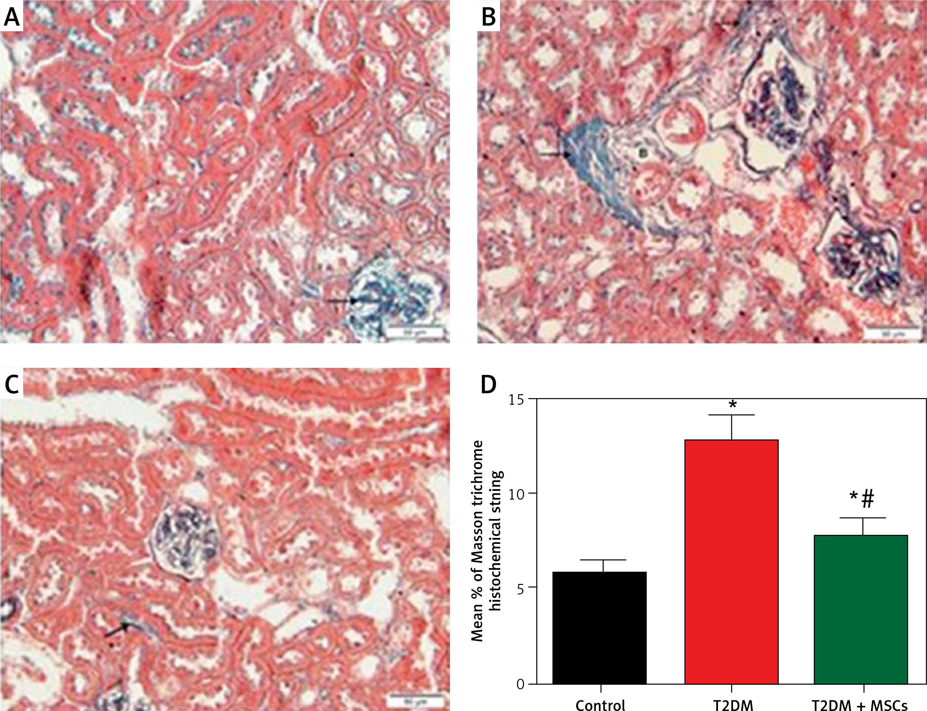 Photomicrographs of Masson-stained sections of the renal cortex. A – Collagen deposition (arrow) in the glomerulus’ interstitium observed in the control group. B – Diabetic group: coarse collagen deposition (arrow) in the deformed glomeruli and renal interstitium between tubules and blood vessels. C – T2DM + MSCs group: modest localized collagen deposition in the glomeruli and convoluted tubules (×200) (50 μm scale bar). D – Calculation of the average area percentage of the collagen deposit