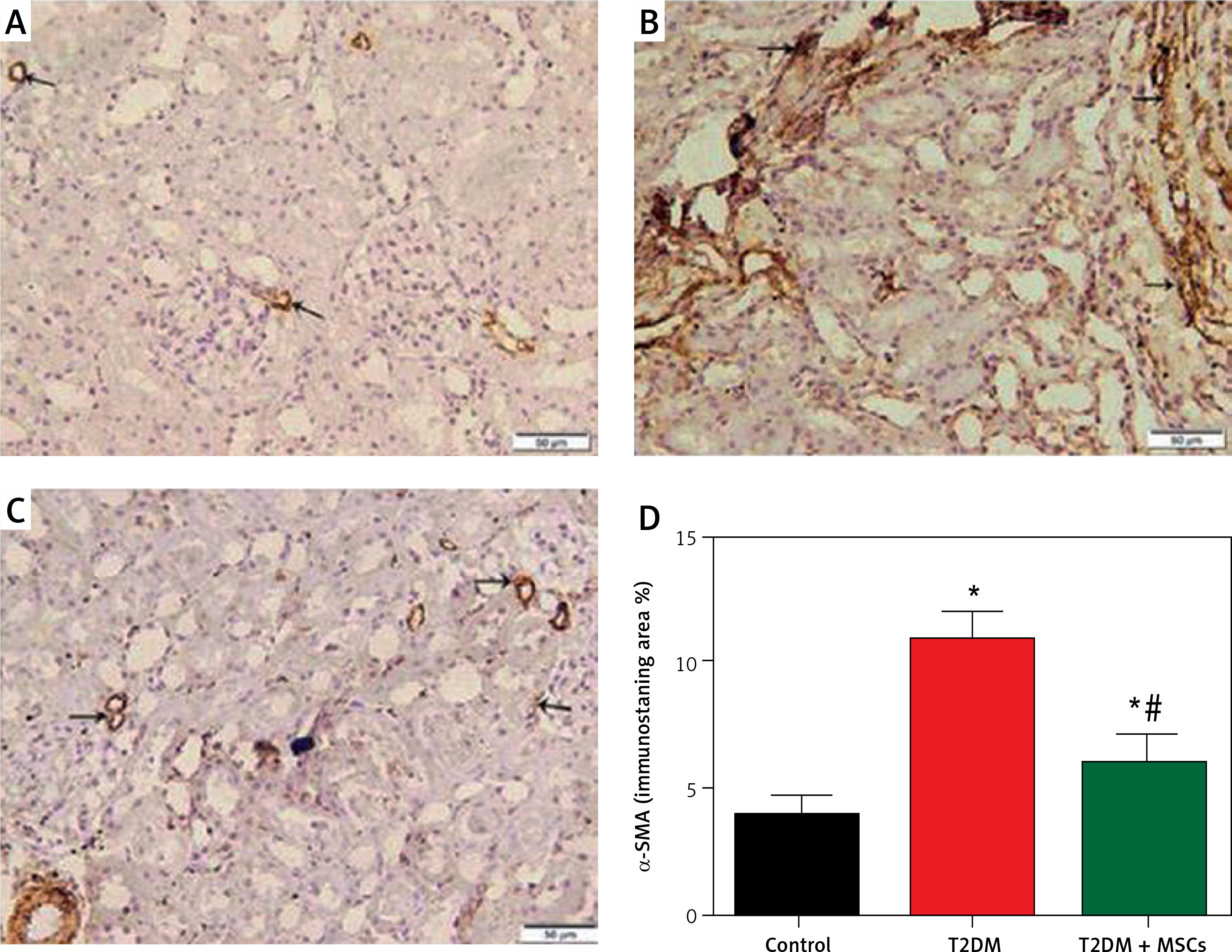 Photomicrographs of α-SMA-stained sections in the renal cortex. A – Control group blood vessel walls with modest positive α-SMA immunostaining (arrow). B – Diabetic group: renal interstitium and blood vessel walls show coarse, widespread positive α-SMA immunostaining (arrow). Minimal positive α-SMA immunostaining (arrow) in the renal interstitium and blood vessel walls (C) T3DM + MSCs group (×200) (50 μm scale bar). D – Calculation of the average percentage of α-SMA immunostaining area