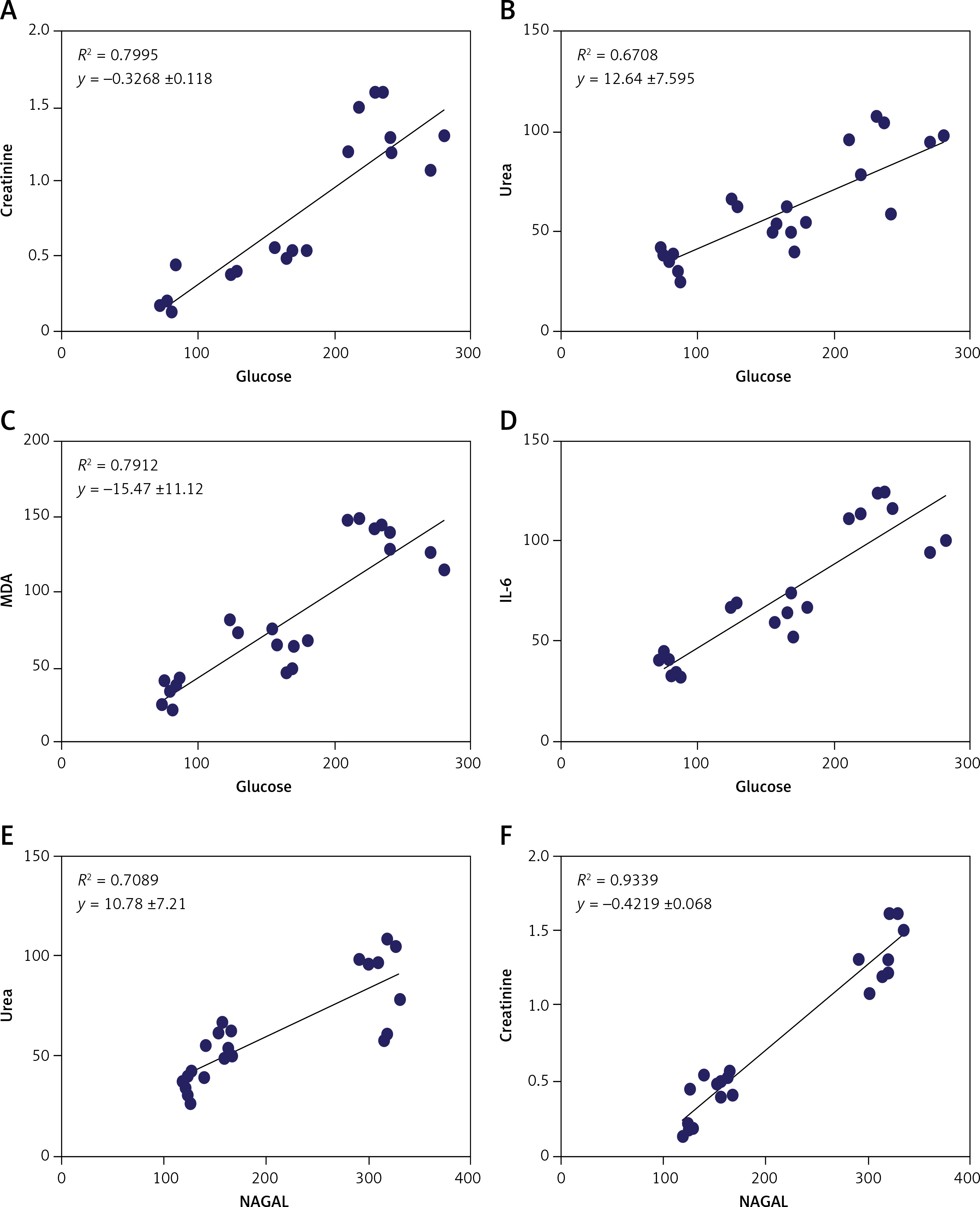 The results showed a positive correlation between increased glycemia versus creatinine, urea, MDA, and IL-6 (A, B, C, and D) and a positive correlation between NAGAL versus urea and creatinine (Figures 8 E and F) (p < 0.0001, n = 24 for all) (Figure 8).