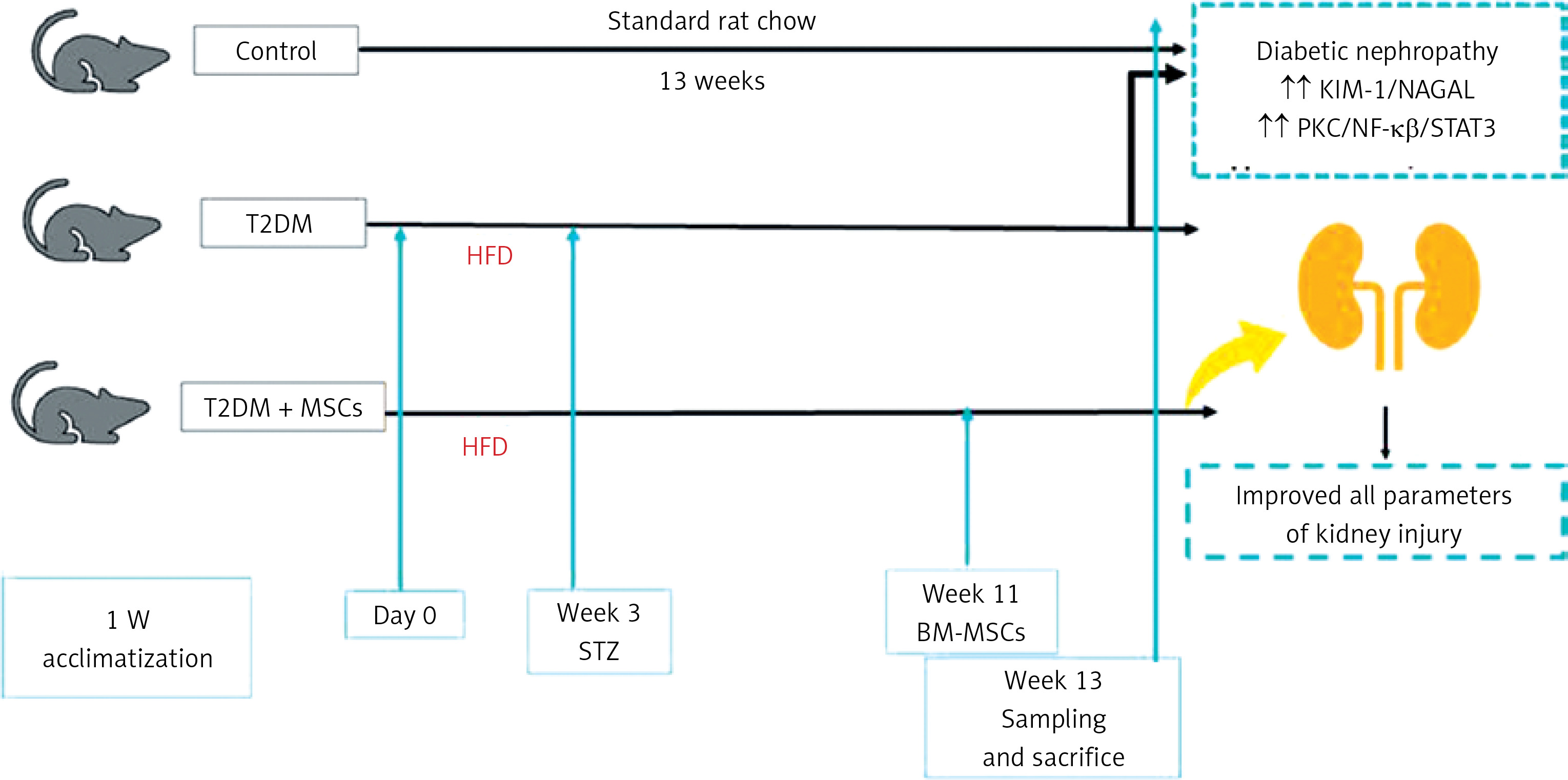 Furthermore, in this animal model, we investigated the relationship between the pathophysiology of T2DM-induced nephropathy, renal impairment, and glycemia. We triggered renal damage in rats by T2DM. Twelve weeks after the development of diabetes in rats, we observed that diabetes could trigger renal PKC/STAT3 axis-mediated renal dysfunction, kidney damage, and fibrosis. Our results suggest that MSCs can suppress the PKC/STAT3 axis. Also, the results of our study indicate a significant link between glycemia, renal dysfunction, and kidney injury biomarkers such as NAGAL, urea, and creatinine. This study highlights the crucial connection between renal dysfunction and the onset of kidney injury in diabetes, emphasizing the renal protective effects of MSCs.