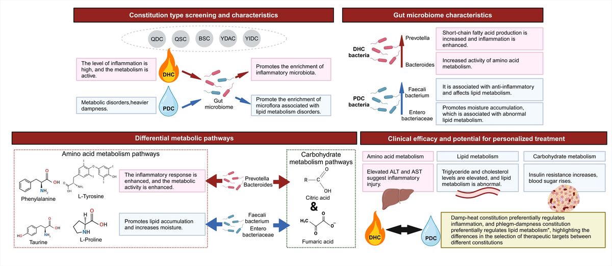 In this study, 51 MASLD patients and 46 healthy controls were classified into seven TCM constitution groups based on high-throughput sequencing of fecal samples. Analyses were conducted to compare microbial communities, metabolite profiles, and metabolic pathways among these constitution groups. The relationships between specific microbiota and biochemical indicators were evaluated using LEfSe and Spearman correlation analyses.