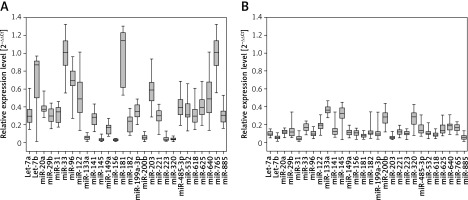 Significant differences were found in levels of 28 miRNAs between the serum samples taken from the HCC patients and healthy subjects (Figure 1 A and B; p < 0.001). Six miRNAs were downregulated in cancer serum samples as compared to controls, while the remaining 22 miRNAs were upregulated.
